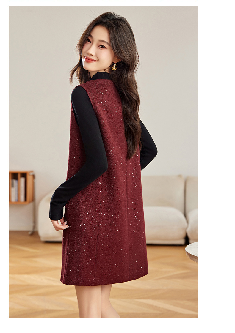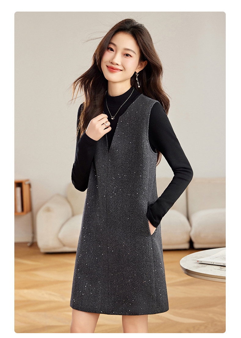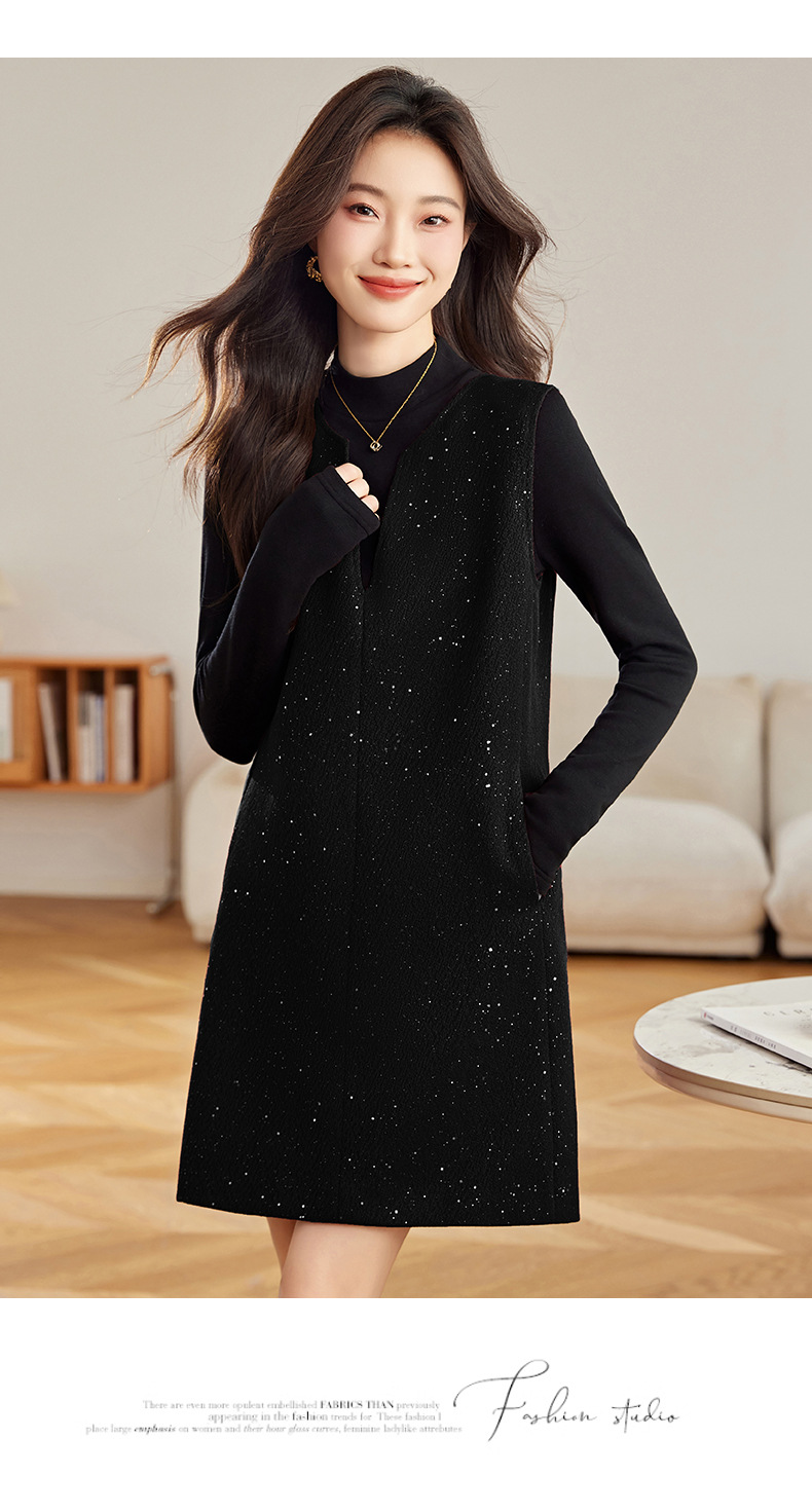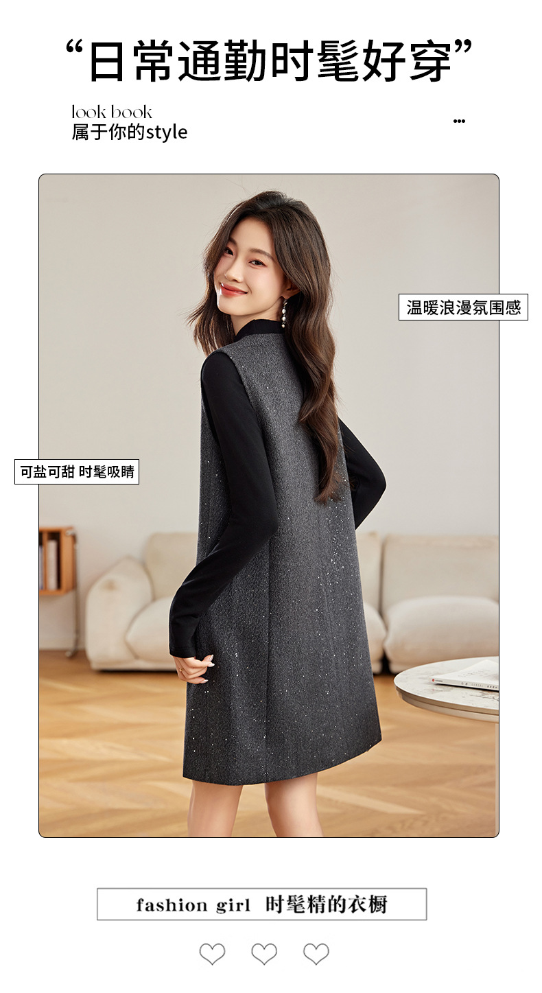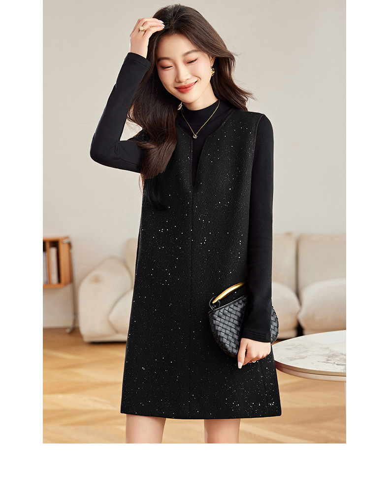 法式小香风毛呢黑色亮片背心裙女秋冬季新款V领高级感外搭马甲裙