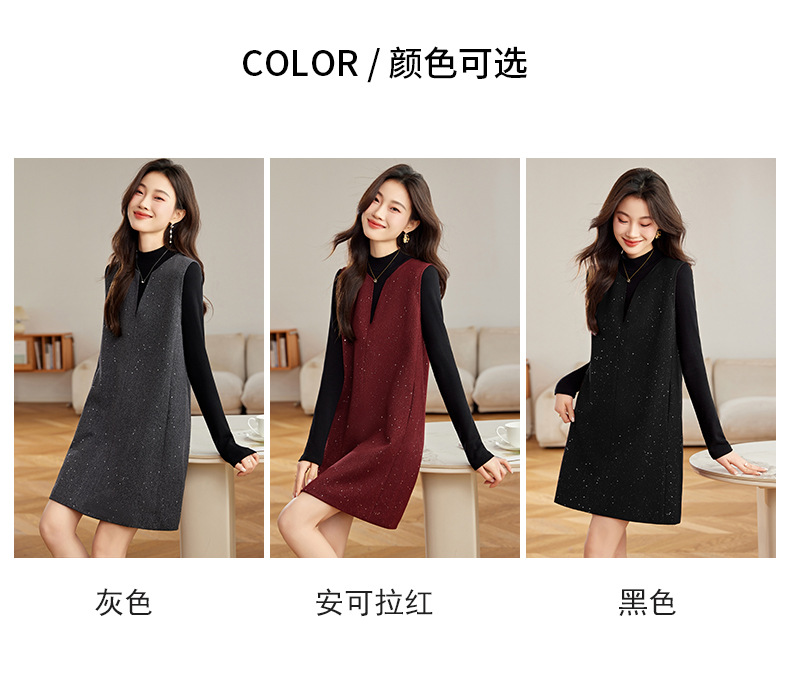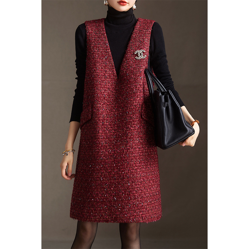 小香风马甲连衣裙2025冬季中长款A字裙女毛呢背心裙V领-