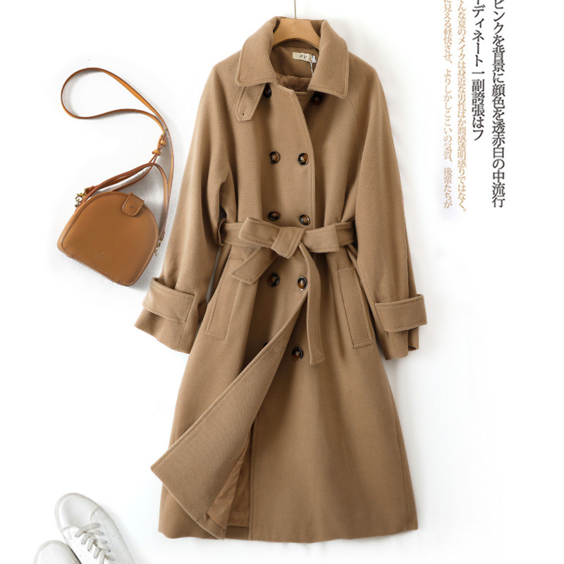 ダブルブレストウールロングコート 2024新作 長袖ラペルベルト付き ミドル丈ウールコート 9034