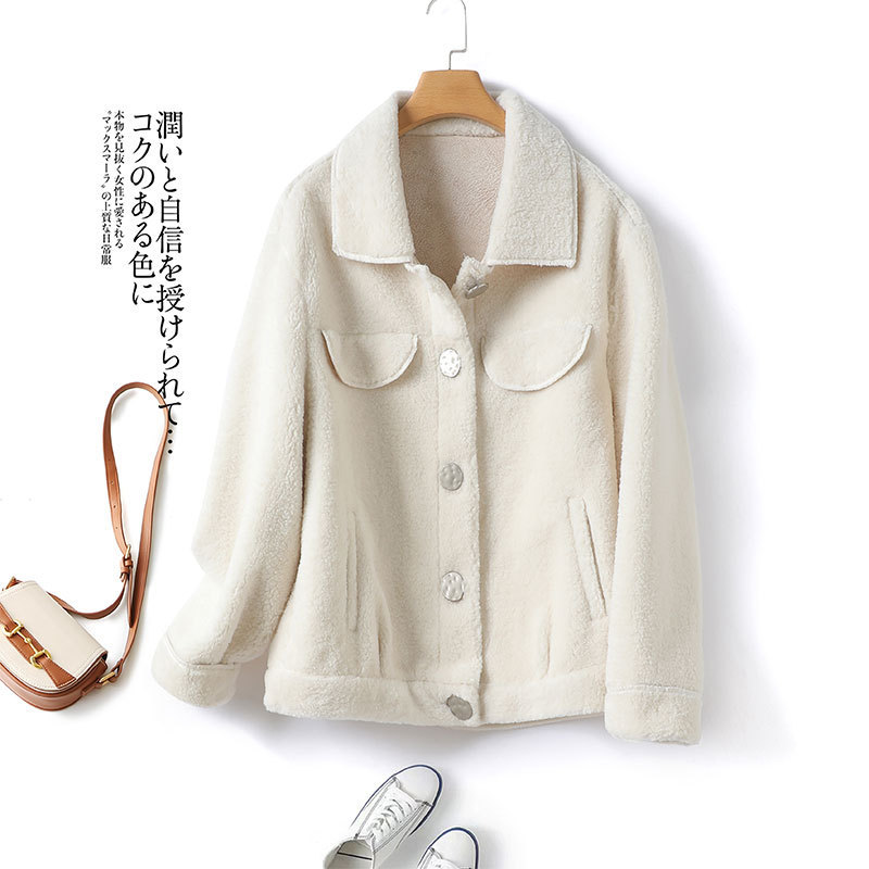 複合ラムウールジャケットレディースショート冬韓国風ラペル厚みのあるシングルブレストルーズジャケット暖かいトップ7677