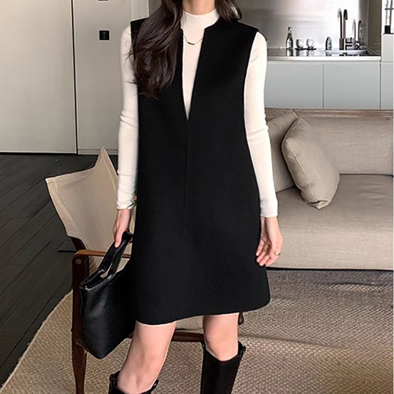现货厂家批发 新款 羊毛双面呢连衣裙女深V领毛呢背心裙A字裙