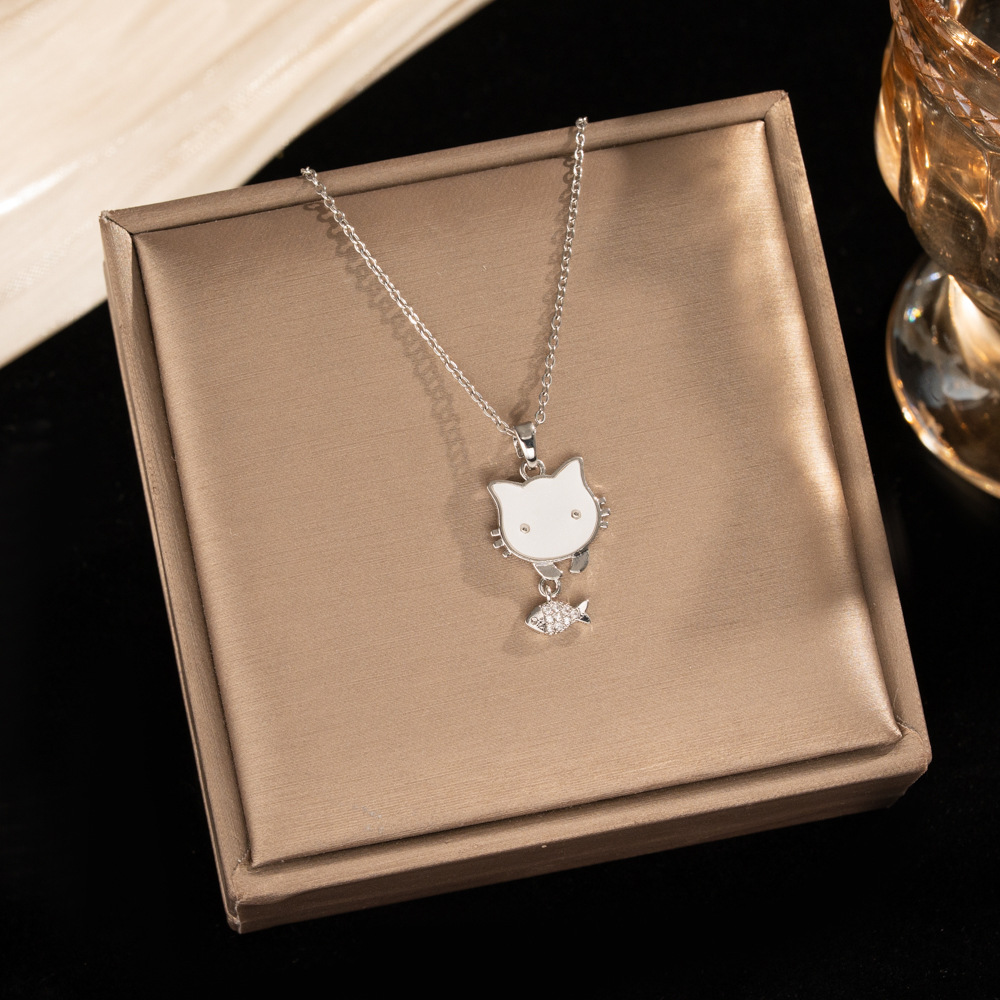 韩版卡通可爱小猫抓鱼钛钢项链女个性设计感猫猫吊坠镶嵌锆石饰品