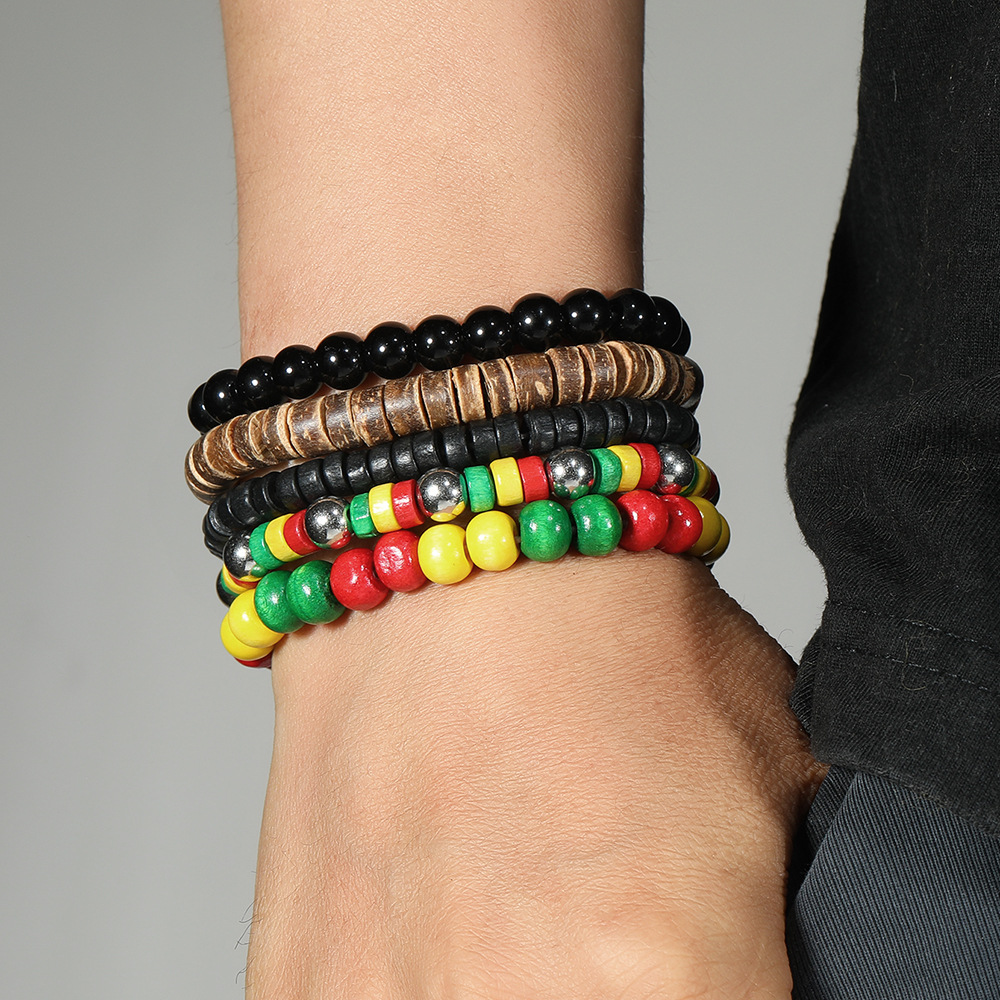 新しい国境を越えて人気のある赤黄緑の古典的な配色木珠ココナツ殻弾力線ブレスレット手作りビーズ工場卸売り