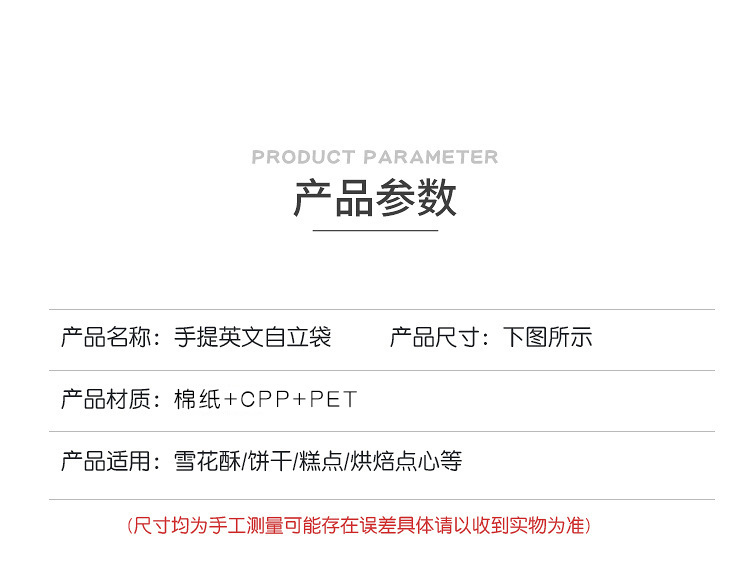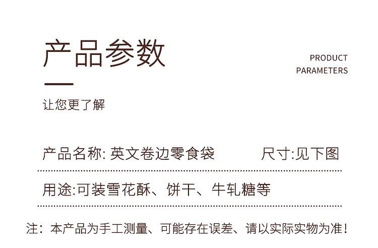 小号手提袋(约装250g)(14*28+10);100一包,小号手提袋(约装250g)(14*28+10);2000个一箱(需按2000倍数拍,否则不发),中号手提袋(约装350g)(17.5*26+11);100一包,中号手提袋(约装350g)(17.5*26+11);2000个一箱(需按2000倍数拍,否则不发),大号手提袋(约装500g)(21*28+11);100一包,大号手提袋(约装500g)(21*28+11);2000个一箱(需按2000倍数拍,否则不发),小号delicieux手提袋(14*28+10);100一包,小号delicieux手提袋(14*28+10);2000个一箱(需按2000倍数拍,否则不发),中号delicieux手提袋(17.5*26+11;100一包,中号delicieux手提袋(17.5*26+11;2000个一箱(需按2000倍数拍,否则不发),大号delicieux手提袋(21*28+11);100一包,大号delicieux手提袋(21*28+11);2000个一箱(需按2000倍数拍,否则不发),定制拿样联系客服;100一包,迷你flavor棕色包装袋(13*23+5.5);100一包,迷你flavor棕色包装袋(13*23+5.5);2000个一箱(需按2000倍数拍,否则不发),小号flavor棕色包装袋(13*28+11);100一包,小号flavor棕色包装袋(13*28+11);2000个一箱(需按2000倍数拍,否则不发),迷你flavor白色包装袋(13*23+5.5);100一包,迷你flavor白色包装袋(13*23+5.5);2000个一箱(需按2000倍数拍,否则不发),小号flavor白色包装袋(13*28+11);100一包,小号flavor白色包装袋(13*28+11);2000个一箱(需按2000倍数拍,否则不发),摩卡棕小号(14*28+10);100一包,摩卡棕小号(14*28+10);2000个一箱(需按2000倍数拍,否则不发),摩卡棕中号(16*28+13);100一包,摩卡棕中号(16*28+13);2000个一箱(需按2000倍数拍,否则不发),摩卡棕大号(22*28+11);100一包,摩卡棕大号(22*28+11);2000个一箱(需按2000倍数拍,否则不发),小号手提袋(小口径全密封);100一包,小号手提袋(小口径全密封);2000个一箱(需按2000倍数拍,否则不发),中号手提袋(小口径全密封);100一包,中号手提袋(小口径全密封);2000个一箱(需按2000倍数拍,否则不发),大号手提袋(小口径全密封);100一包,大号手提袋(小口径全密封);2000个一箱(需按2000倍数拍,否则不发),小号bakery手提袋(小口径全密封);100一包,小号bakery手提袋(小口径全密封);2000个一箱(需按2000倍数拍,否则不发),中号bakery手提袋(小口径全密封);100一包,中号bakery手提袋(小口径全密封);2000个一箱(需按2000倍数拍,否则不发),大号bakery手提袋(小口径全密封);100一包,大号bakery手提袋(小口径全密封);2000个一箱(需按2000倍数拍,否则不发),小号红色delicious手提袋(小口径全密封);100一包,小号红色delicious手提袋(小口径全密封);2000个一箱(需按2000倍数拍,否则不发),中号红色delicious手提袋(小口径全密封);100一包,中号红色delicious手提袋(小口径全密封);2000个一箱(需按2000倍数拍,否则不发),大号红色delicious手提袋(小口径全密封);100一包,大号红色delicious手提袋(小口径全密封);2000个一箱(需按2000倍数拍,否则不发),雪花酥贴纸【7.5*6.5cm】;100贴,纯手工制作贴纸【7.5*6.5cm】;100贴,牛轧糖贴纸【7.5*6.5cm】;100贴,牛轧饼干贴纸【7.5*6.5cm】;100贴,点心局贴纸【7.5*6.5cm】;100贴,奶枣贴纸【7.5*6.5cm】;100贴,太妃糖贴纸【7.5*6.5cm】;100贴,糯米船贴纸【7.5*6.5cm】;100贴