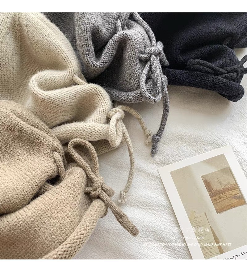网红堆堆帽女秋冬显脸小包头冷帽大头围护耳抽绳卷边针织毛线帽子