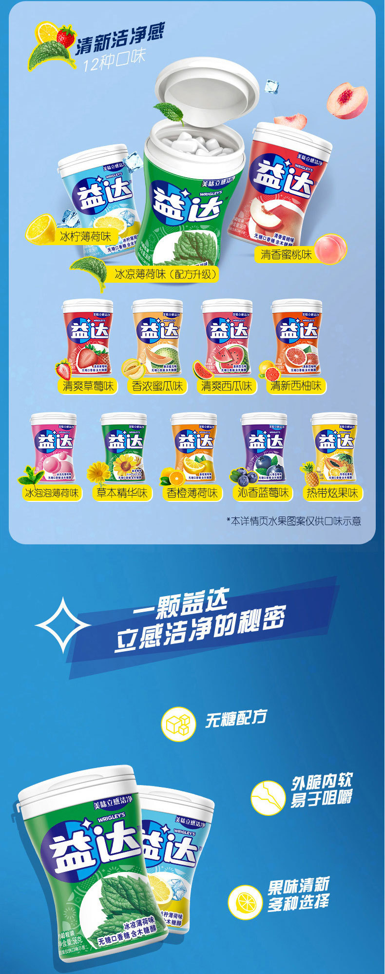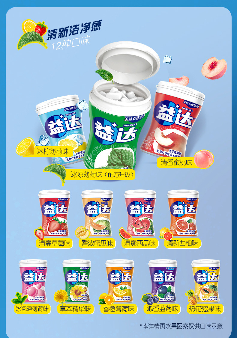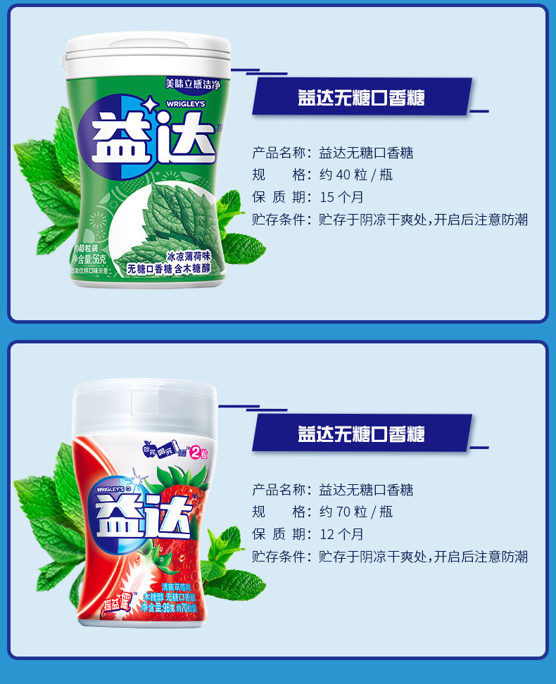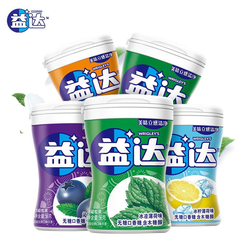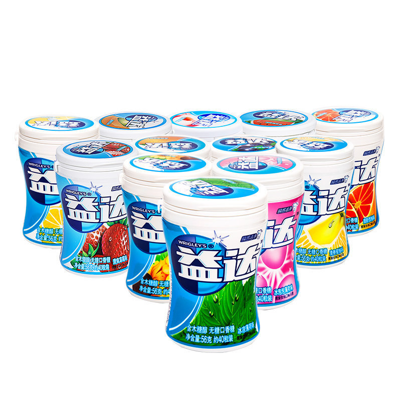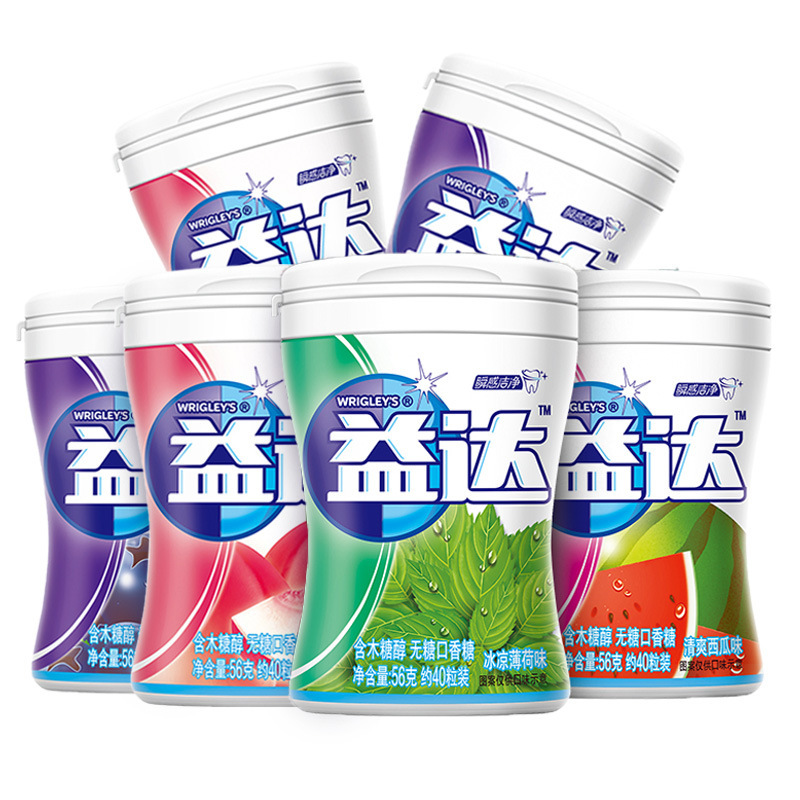 包装规格 益达木糖醇56g【奔涌西瓜味】40粒装(单瓶),益达40粒装【冰泡泡薄荷味】56g(单瓶),益达40粒装【清爽草莓味】56g(单瓶),益达木糖醇56g【清爽蜜瓜味】40粒装(单瓶),益达40粒装【清爽薄荷味】56g(单瓶),益达40粒装【冰爽柠檬味】56g(单瓶),益达40粒装【阳光香橙味】56g(单瓶),益达40粒装【元气蓝莓味】56g(单瓶),益达40粒装【元气白桃味】56g(单瓶),益达木糖醇56g【冰川薄荷味】40粒装(单瓶),益达【草本精华味】56g单瓶(40粒),益达【清新西柚】56g单瓶(40粒),益达【热带炫果味】56g单瓶(40粒),绿箭【原味薄荷味】40粒瓶装56g(单瓶),绿箭【茉莉绿茶味】40粒瓶装56g(单瓶),绿箭口香糖40粒装【玫瑰花味】56g(单瓶),绿箭【原味薄荷味】40粒瓶装【64g】(单瓶),绿箭【绿茶薄荷味】40粒瓶装【64g】(单瓶),绿箭【柠檬薄荷味】脆皮软心薄荷糖80g瓶装(单瓶),绿箭【原味薄荷味】脆皮软心薄荷糖80g瓶装(单瓶),绿箭【草莓薄荷味】脆皮软心薄荷糖80g瓶装(单瓶)