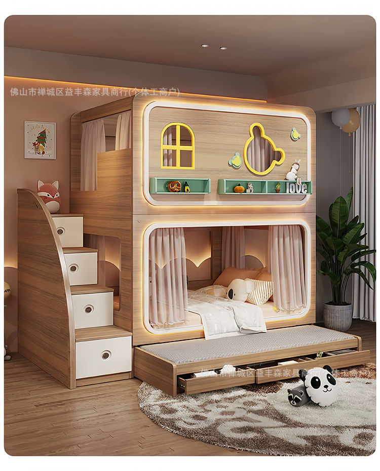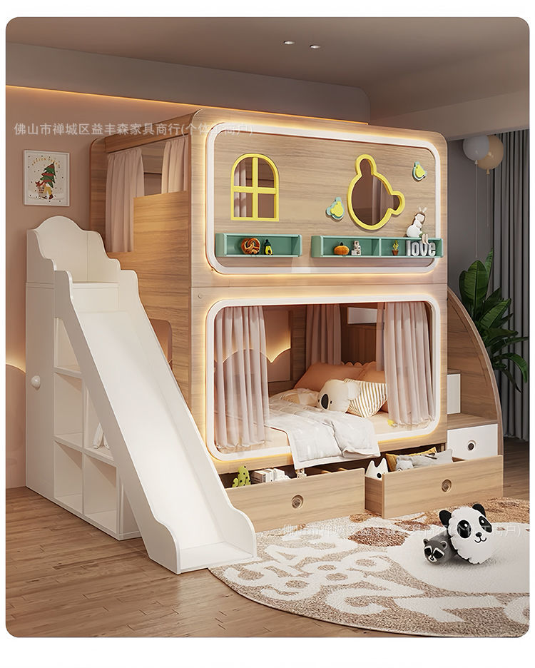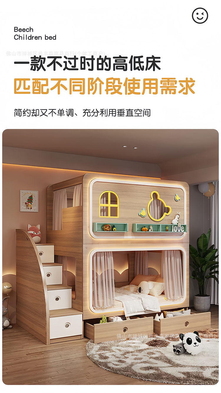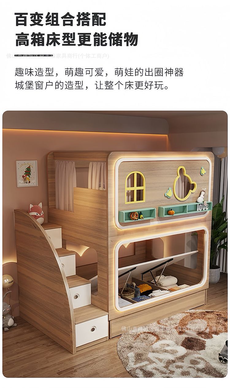 简约现代原木色儿童床上下床高低床带梯柜子母床滑梯双层床组合床