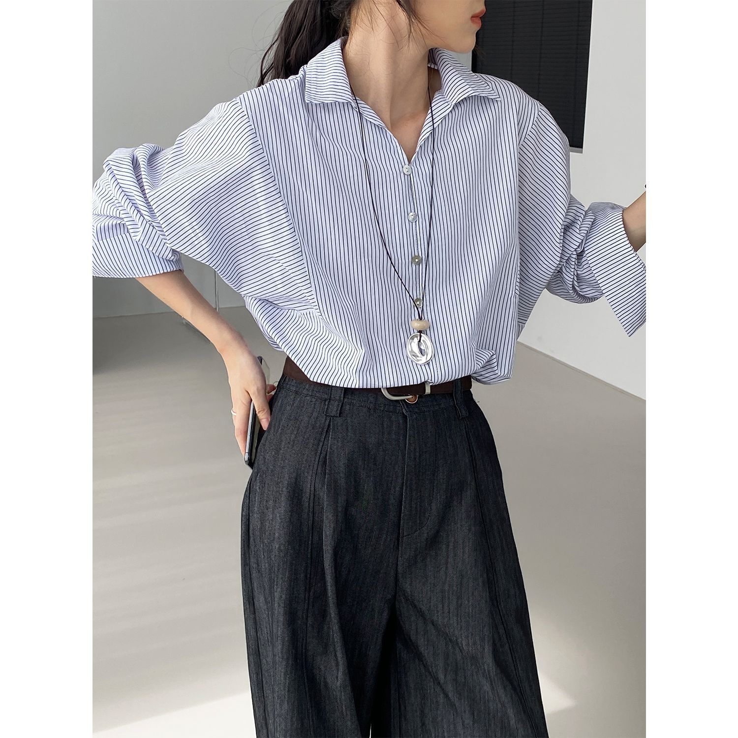 那末 韩系通勤减龄条纹衬衫女宽松显瘦设计感小众长袖上衣6123