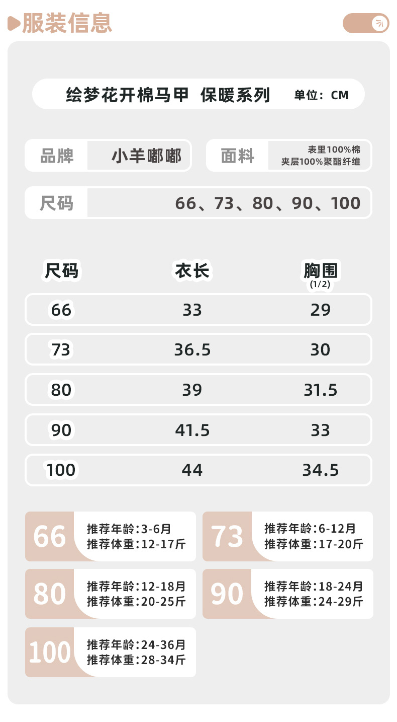 适合身高 66(建议3-6月12-14斤),73(建议6-12月14-20斤),80(建议12-18月20-26斤),90(建议18-24月26-29斤),100(建议24-36月29-35斤)