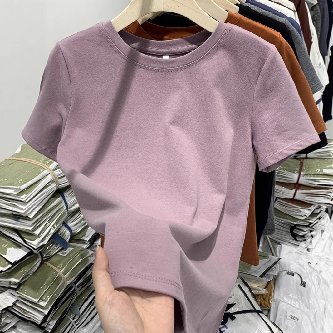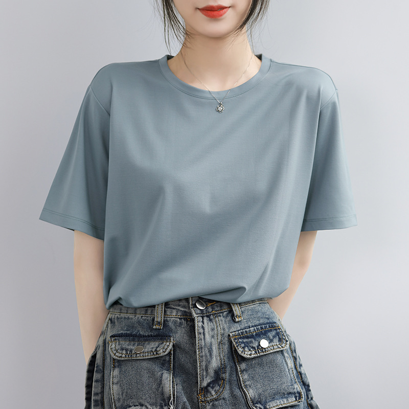 グレーブルーのコットン半袖Tシャツ女性用2025新しいルーズ半袖ハイエンドの見事でシックなトップTシャツ