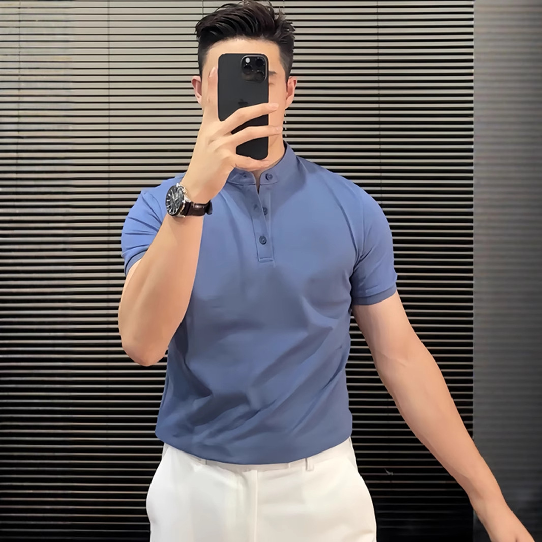 綿スタンドカラー半袖ポロシャツメンズ無地スリムフィット2025夏若者ハンサムビジネスヘンリーカラーTシャツ