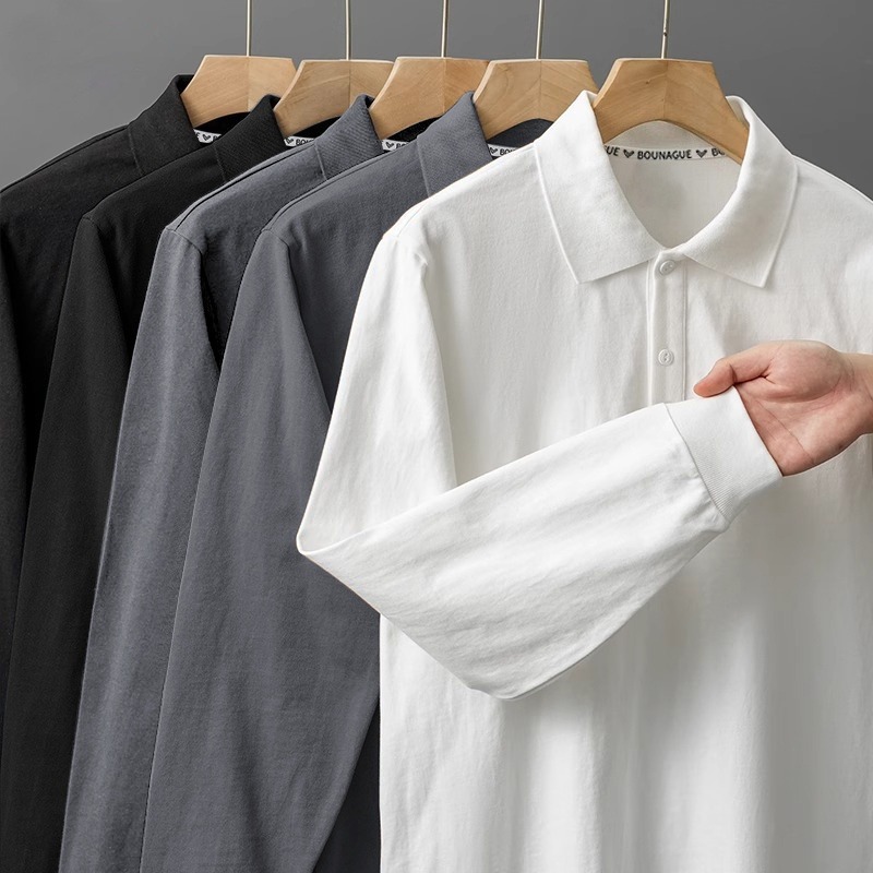 重磅纯棉POLO衫男士长袖春秋季新款纯色打底衫休闲宽松翻领卫衣男