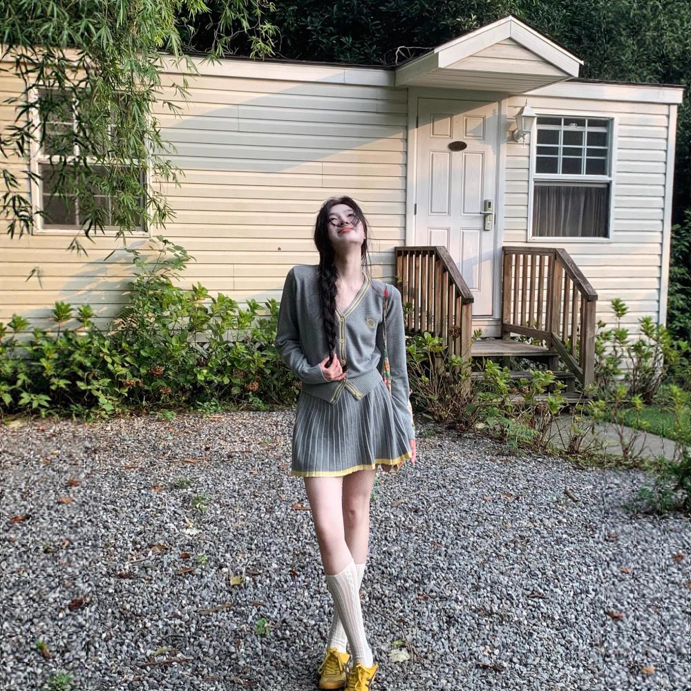 慵懒气质miu系学院风灰色V领针织开衫+百褶半身裙套装甜美两件套