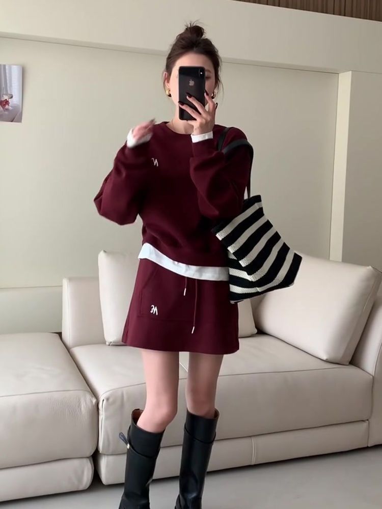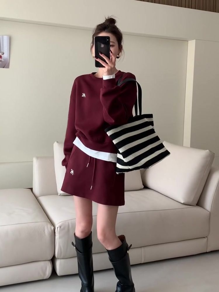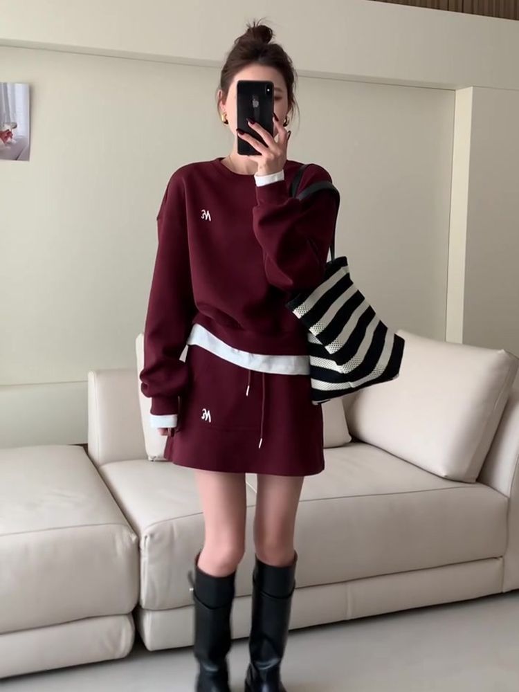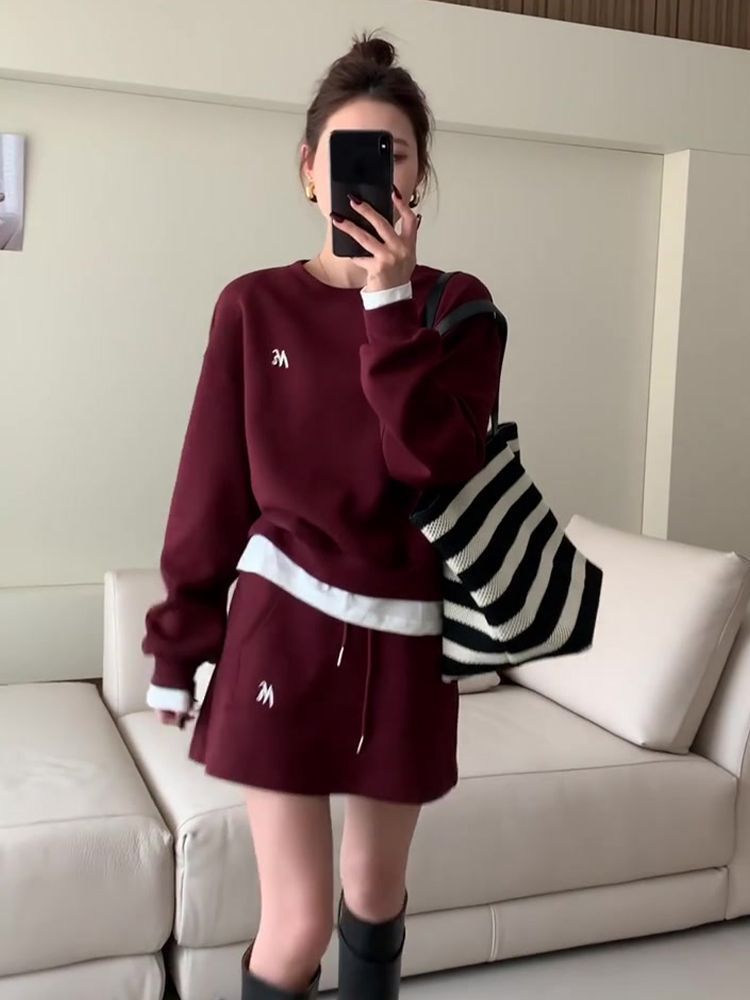 胖mm特大码300斤2025春春秋洋气约会套装裙女酒红色时尚卫衣套装