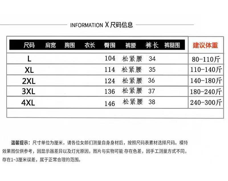 尺码 L建议80-110斤,XL建议110-145斤,2XL建议145-190斤,3XL建议190-240斤,4XL建议240-300斤