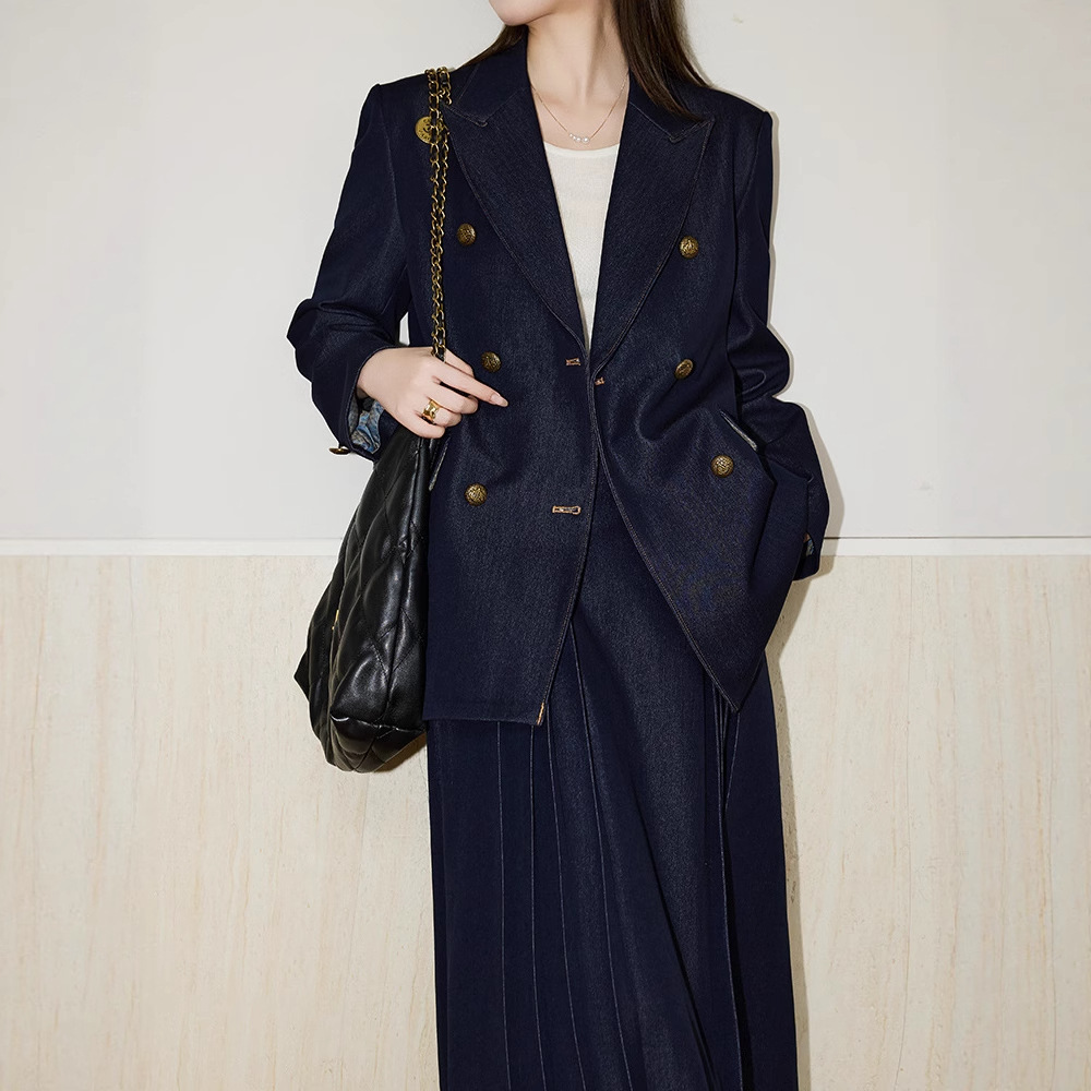 西装外套女双排扣斜纹设计感+垂坠感半身裙秋季斜纹复古气质长裙