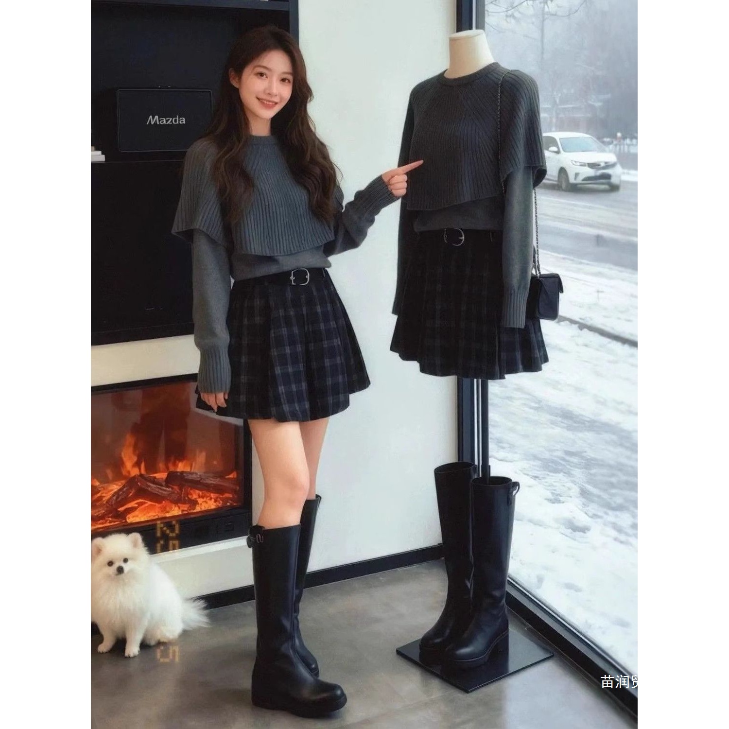 2025秋冬穿搭一整套斗篷针织毛衣格纹短裙半裙独特漂亮两件套装女
