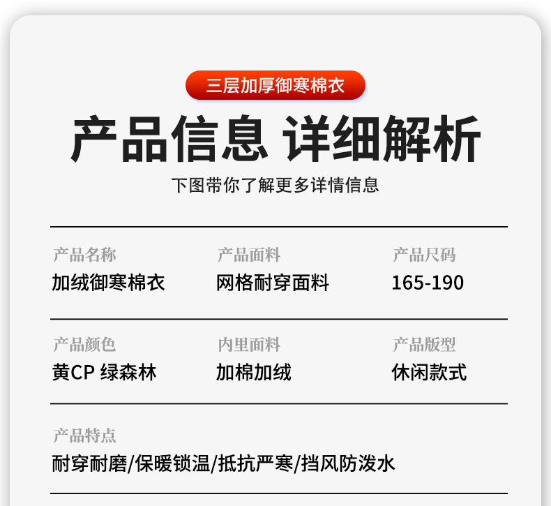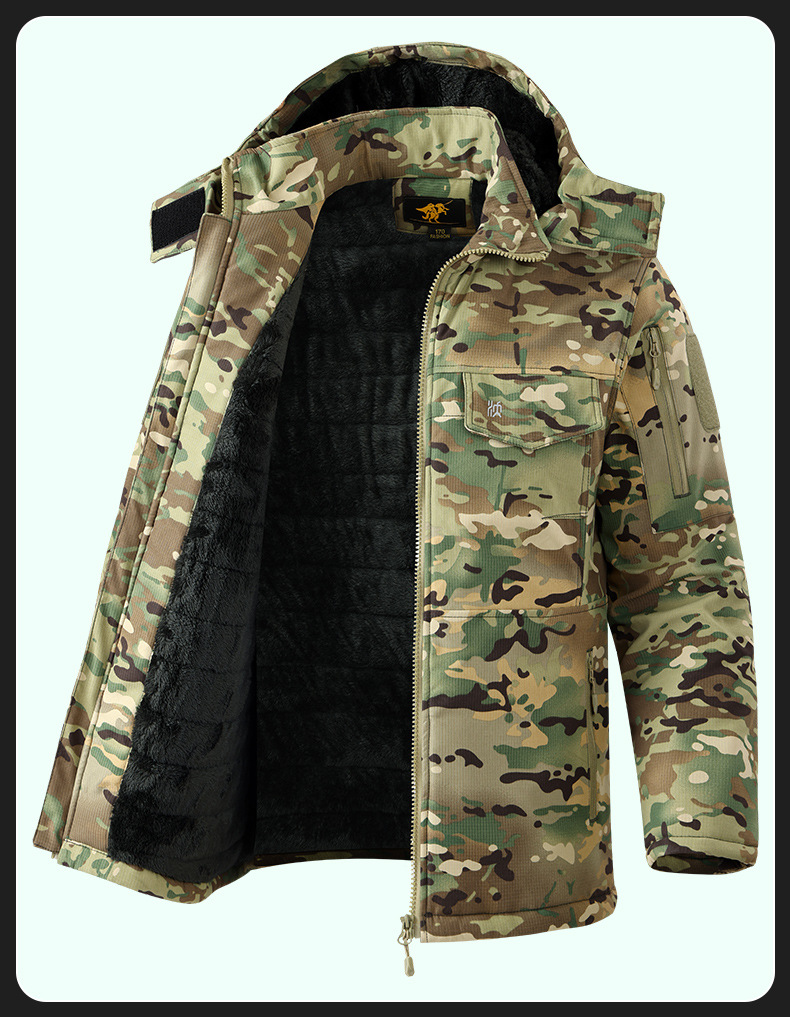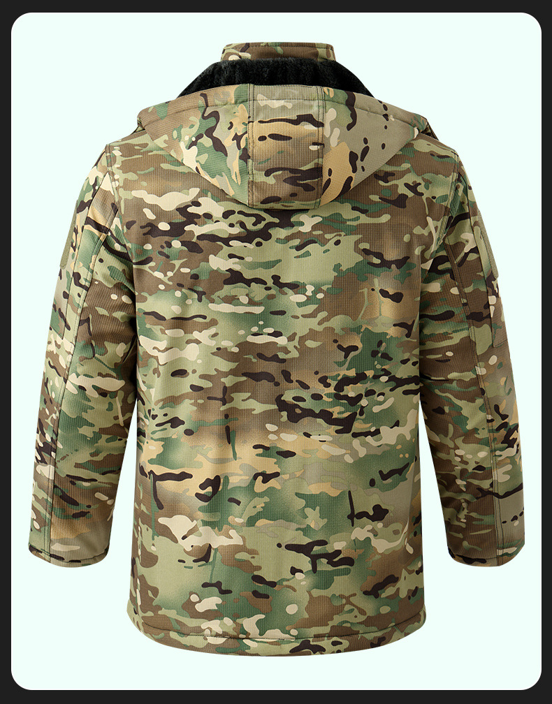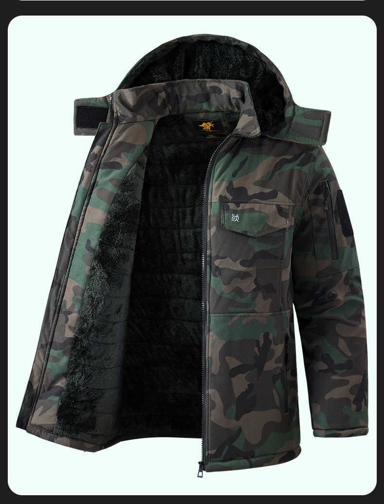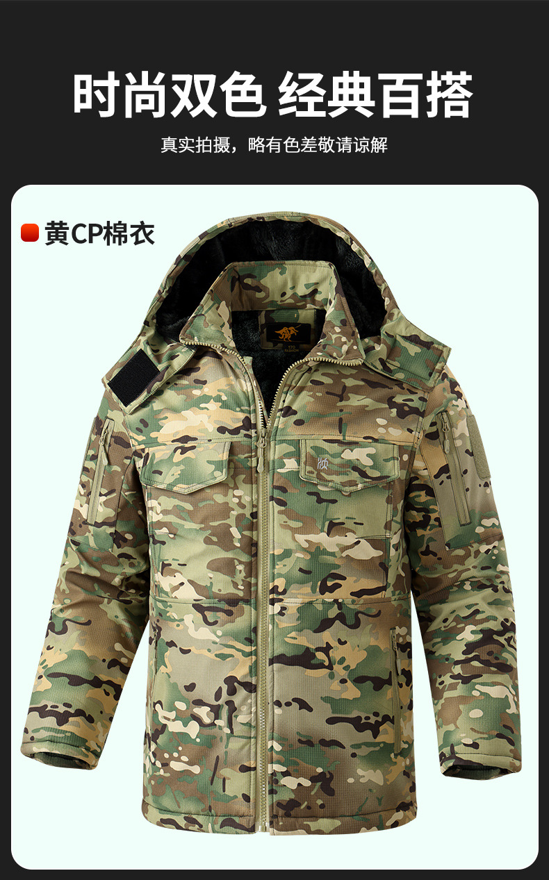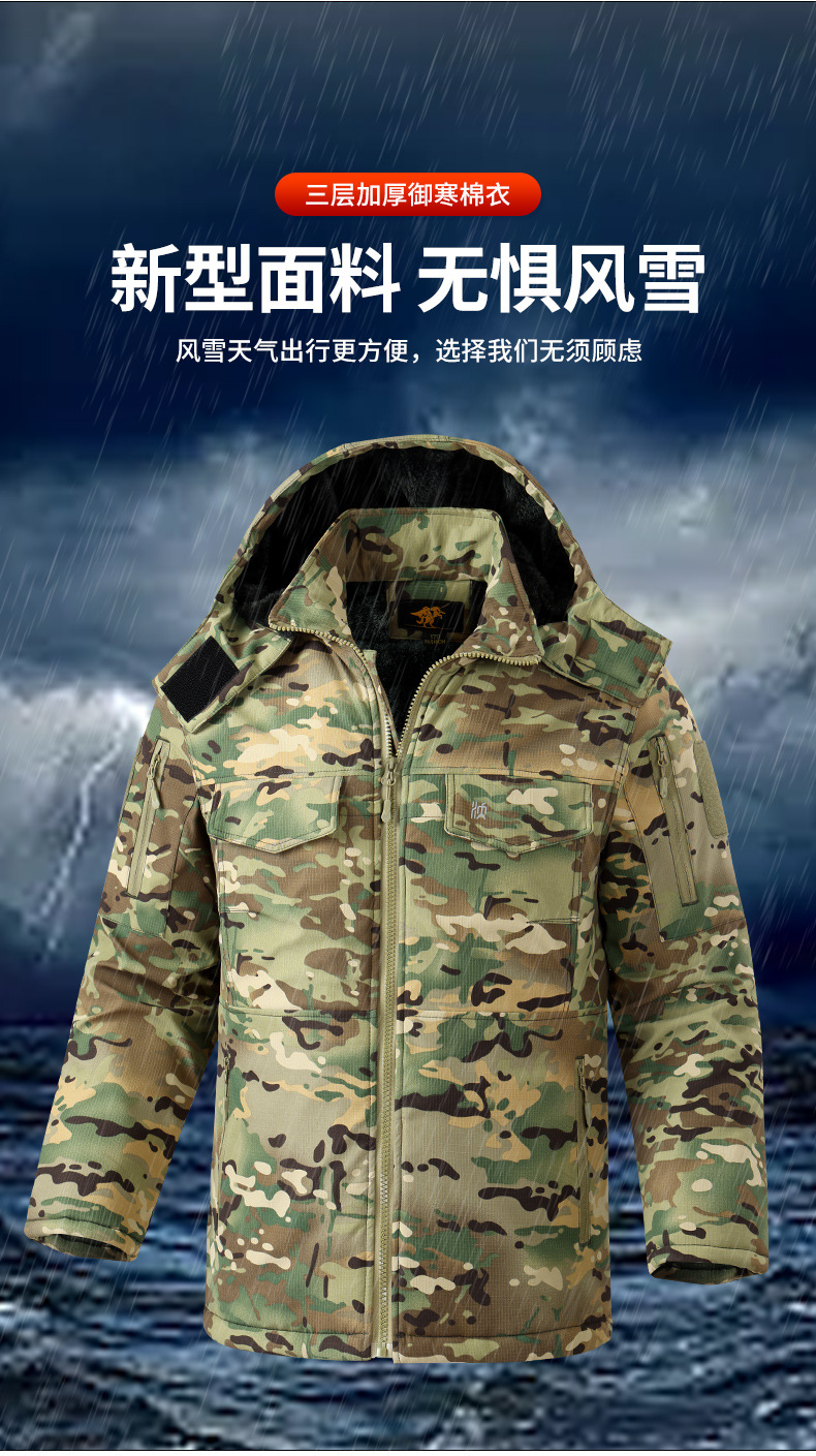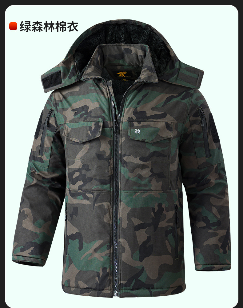 冬季加棉加厚棉衣迷彩棉袄绗缝加棉内里帽子可拆卸网格面料男多兜