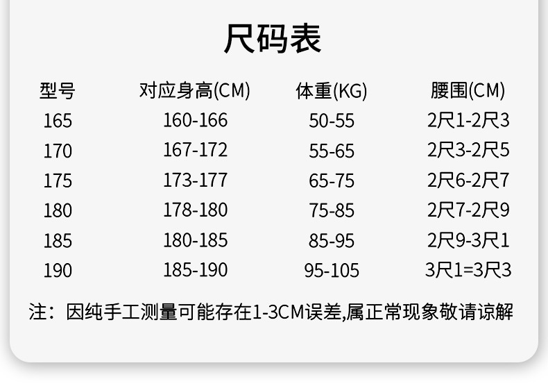 尺码 165码【建议90-110斤】,170码【建议110-120斤】,175码【建议120-140斤】,180码【建议140-160斤】,185码【建议160-175斤】,190码【建议175-190斤】,195码【建议190-210斤】