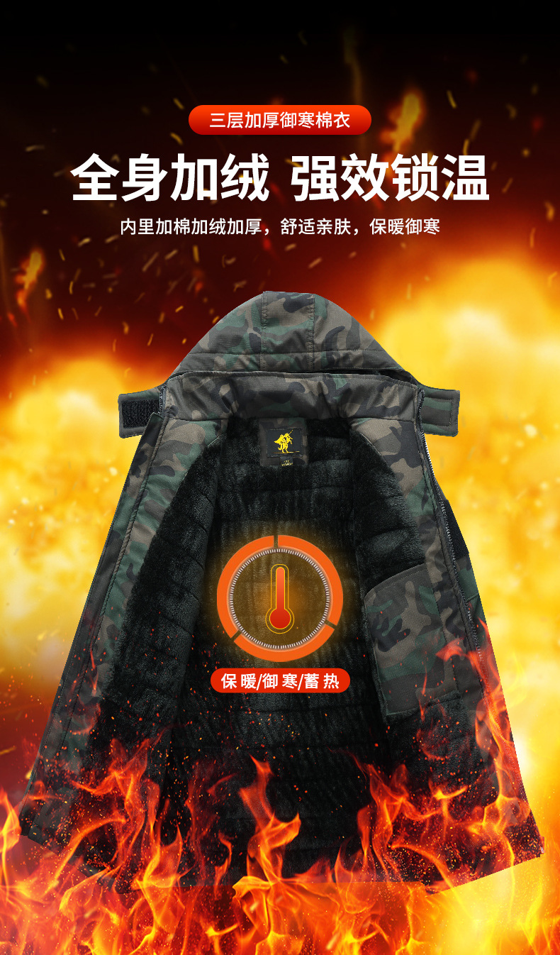 迷彩綿服にベルベットをつけて防水防寒綿を厚くした冬の労働保護反射条綿入れ綿入れコートの中の長いタイプの男性