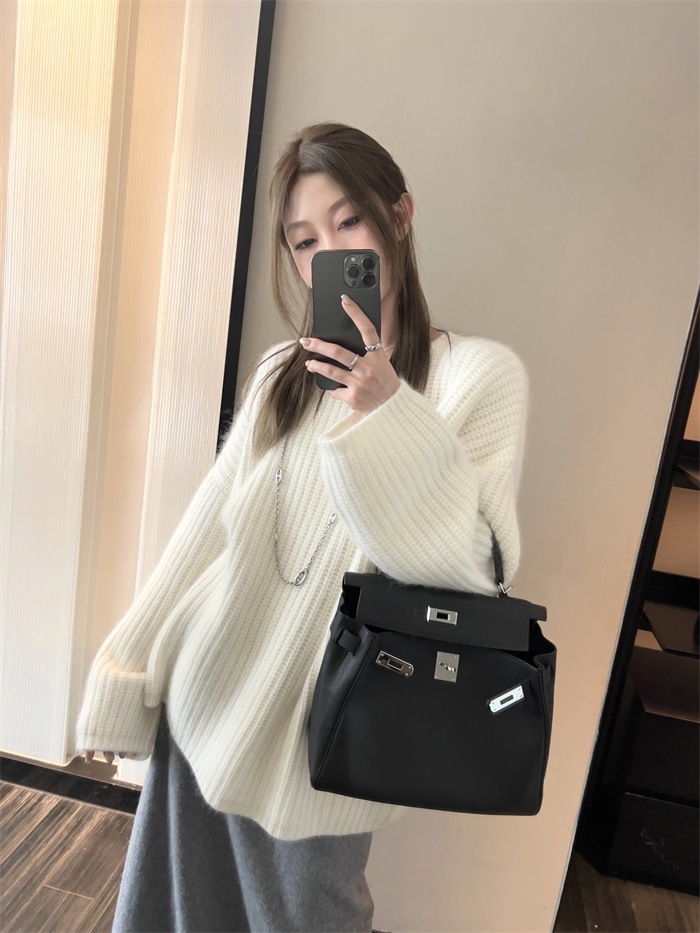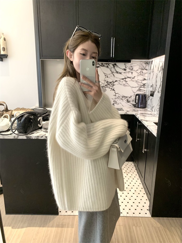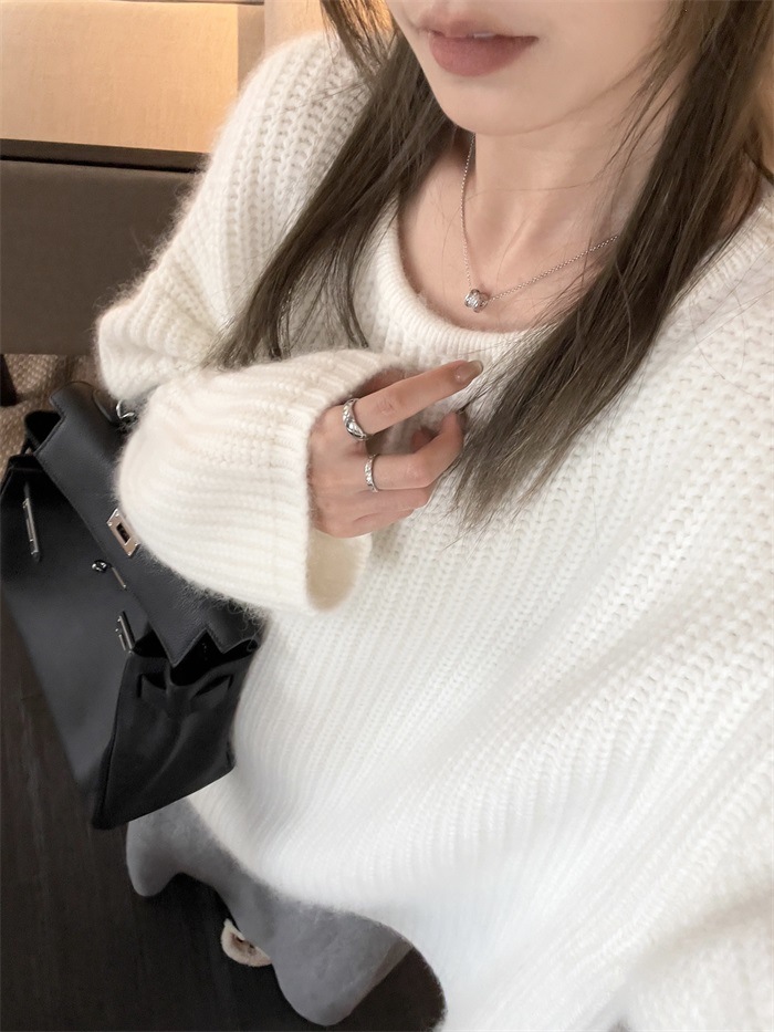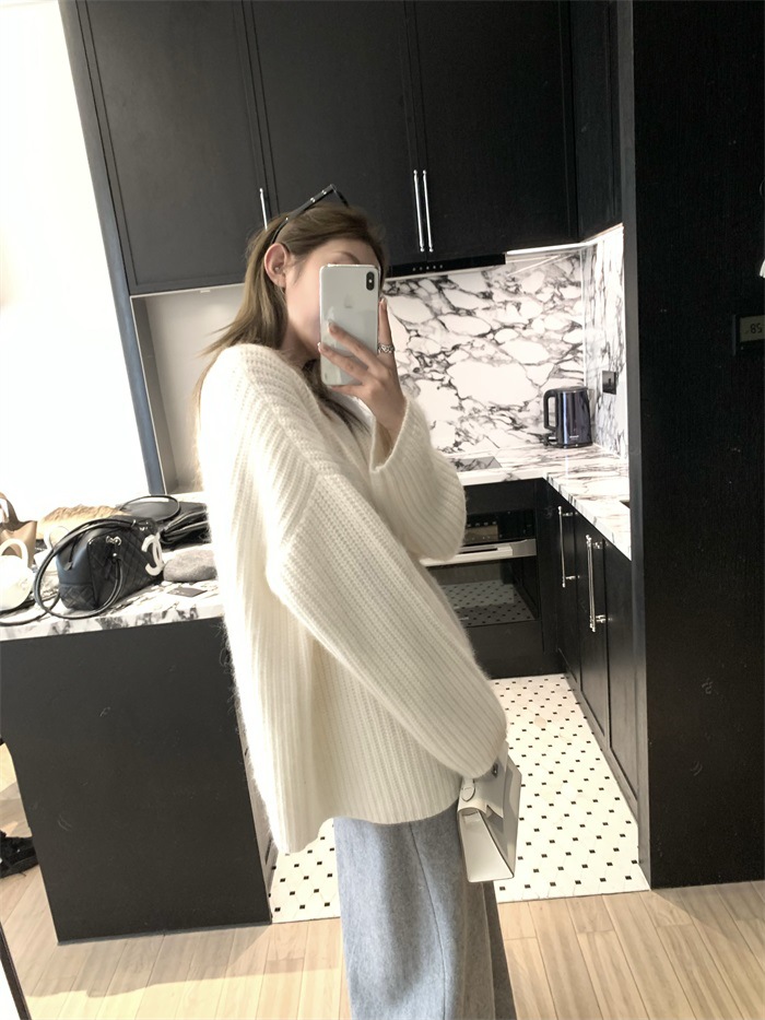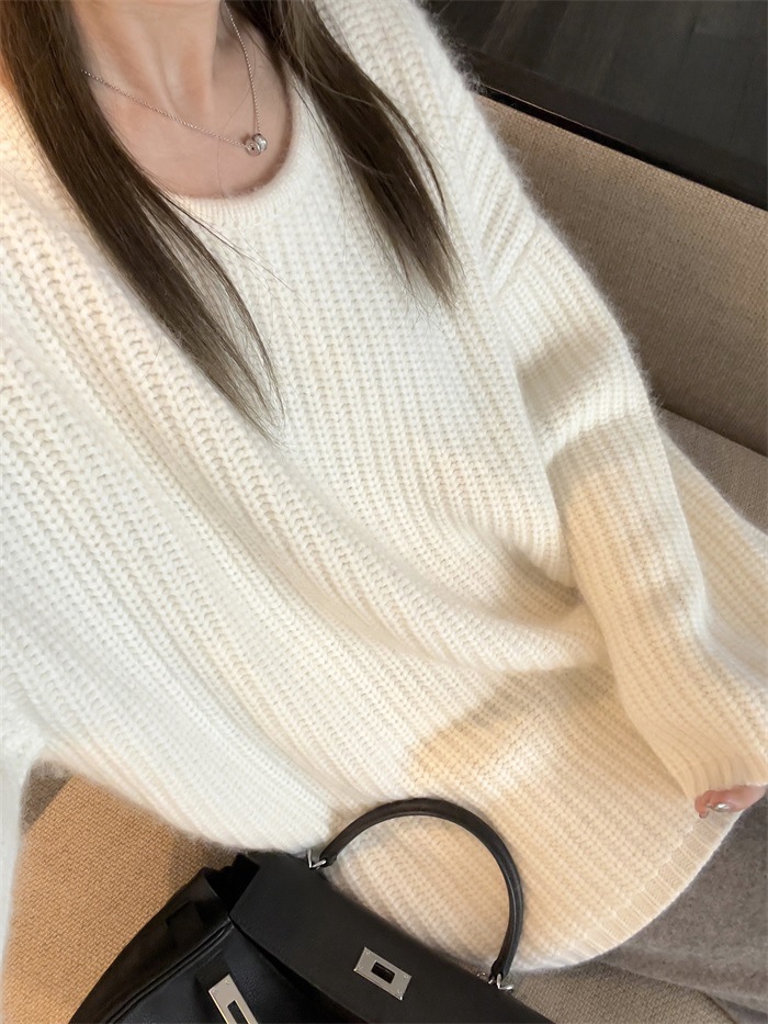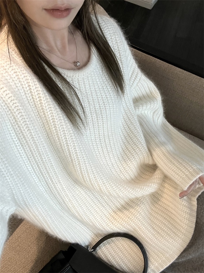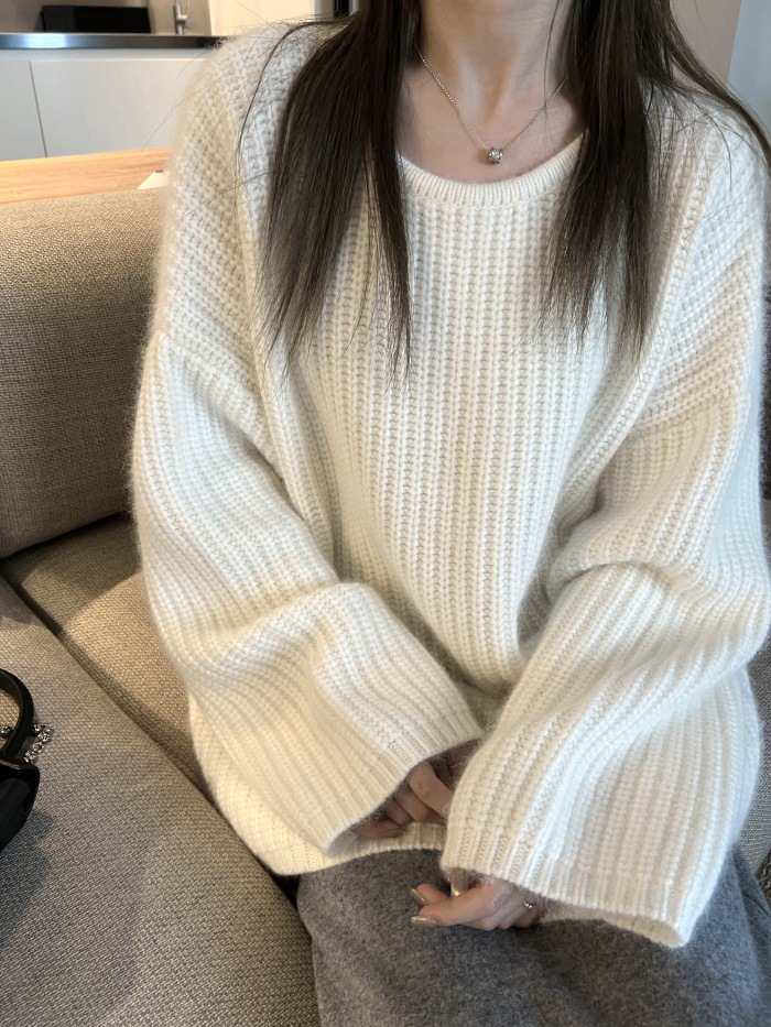 韓国風ゆったりウールセーター レディース 2025秋冬 欧米風 厚手カシミヤ ラウンドネック 無地 太糸セーター
