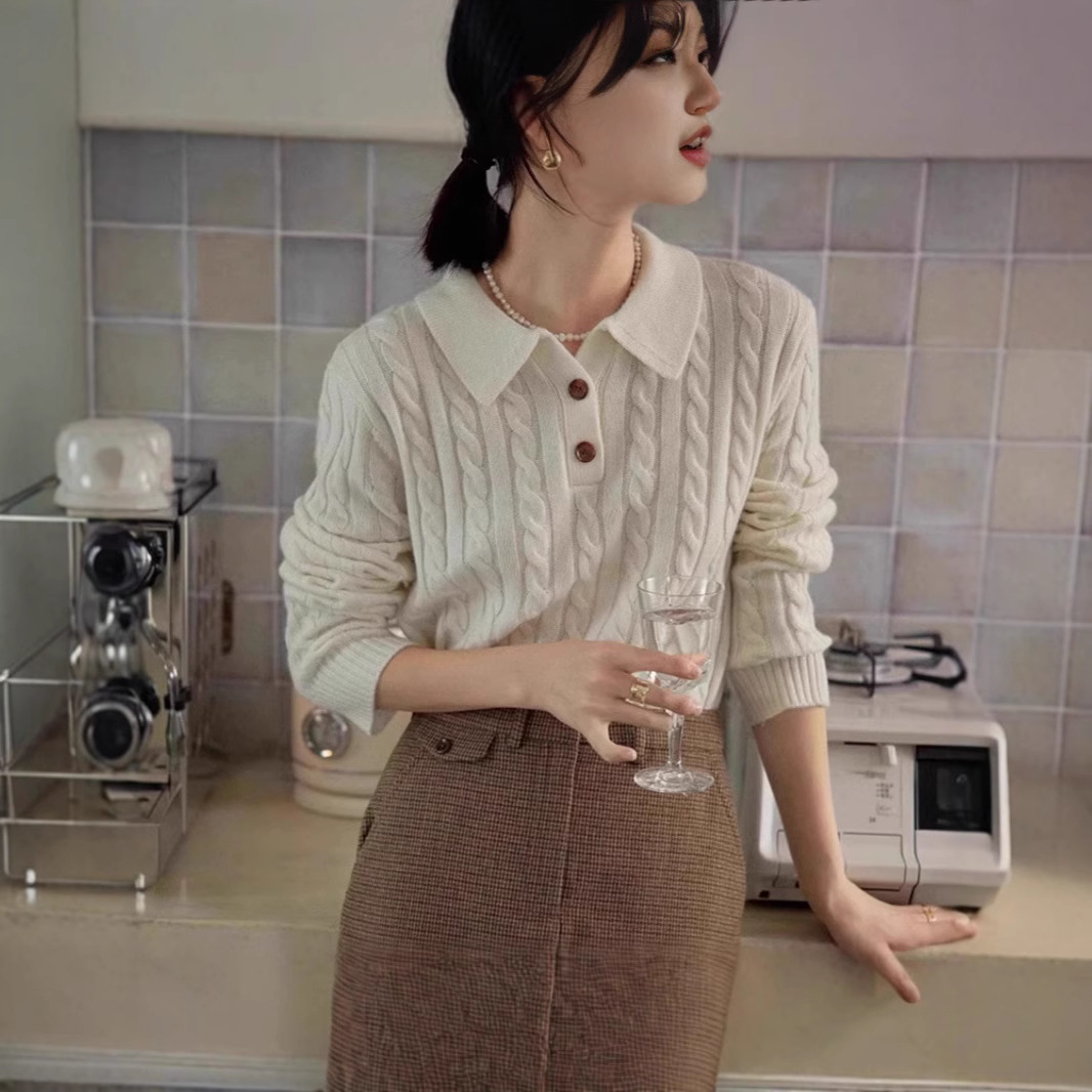 2025秋冬新款POLO领绞花厚款上衣女羊毛衫针织打底衫长袖宽松套头