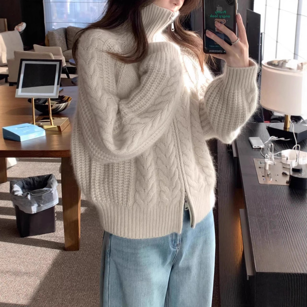 重磅加厚100%纯羊毛衫女复古麻花双拉链翻领针织开衫毛衣外套上衣
