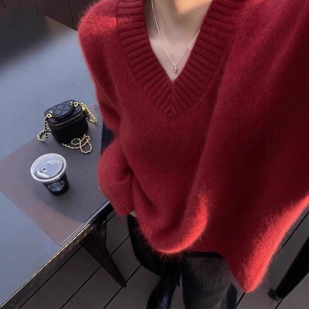 慵懒风100羊毛衫v领套头红毛衣女25秋冬加厚宽松软糯针织衫上衣