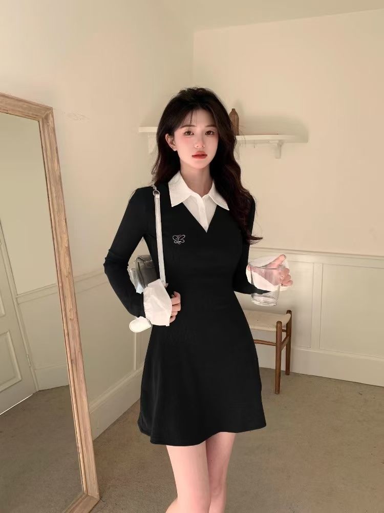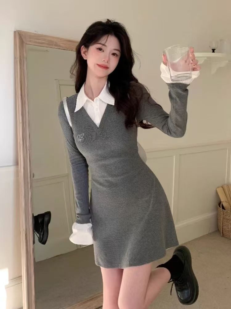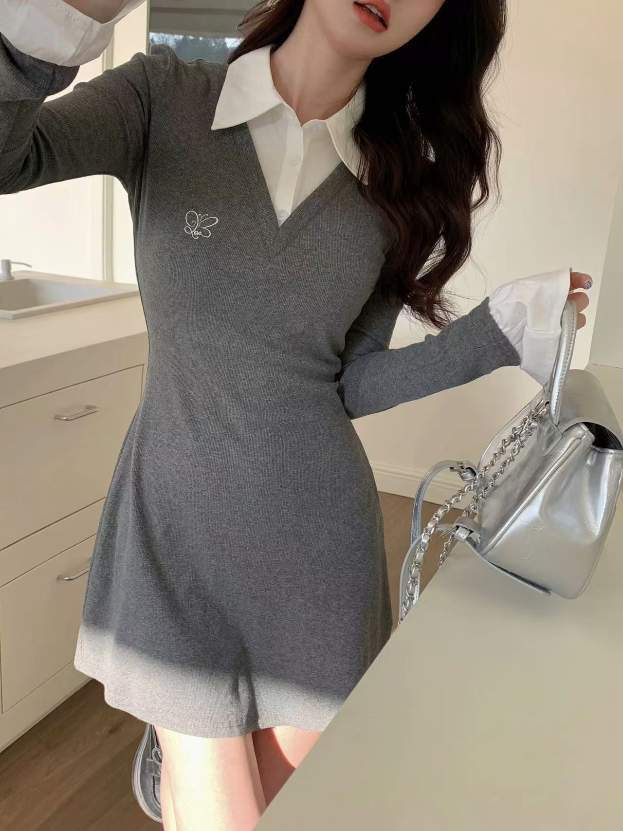 假两件灰色POLO领连衣裙子女秋冬季2025新气质辣妹打底内搭包臀裙