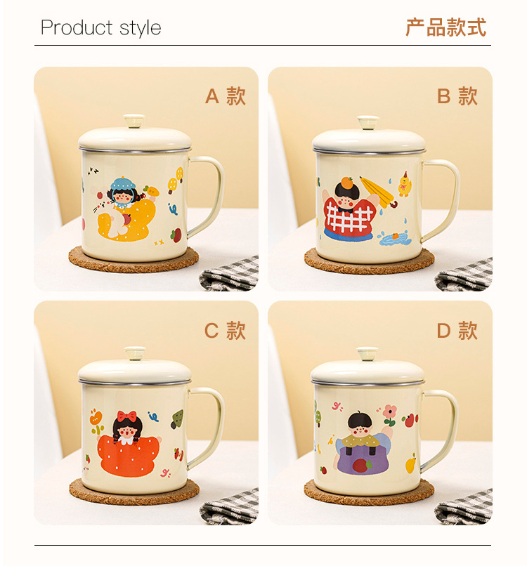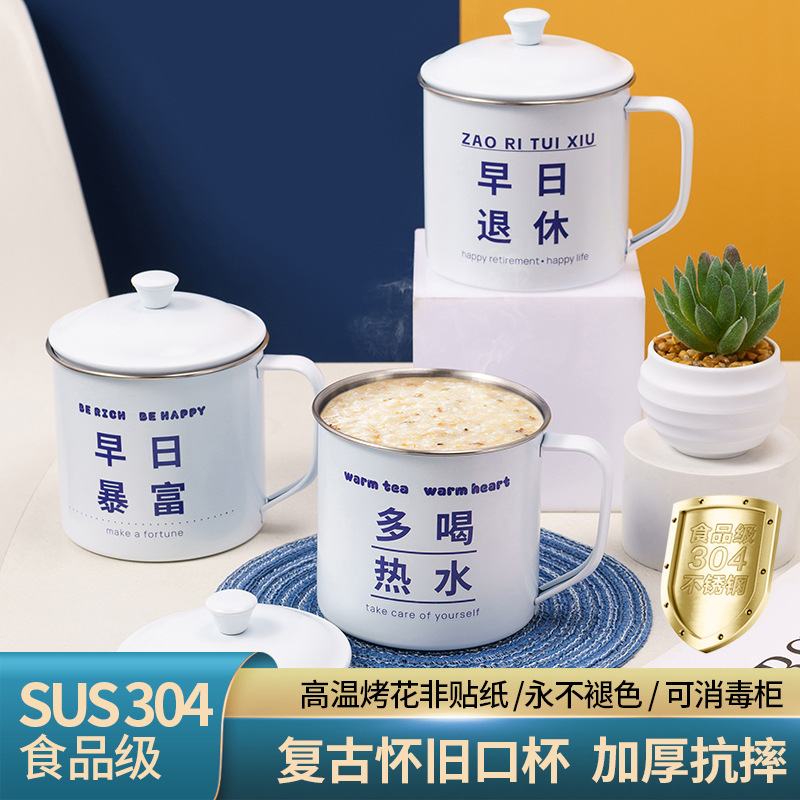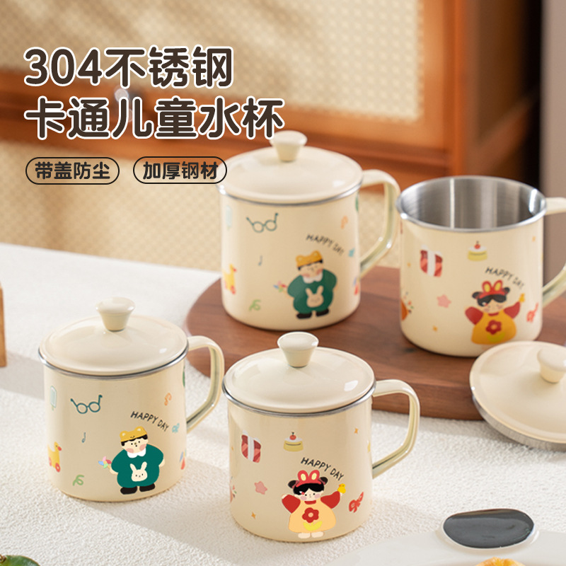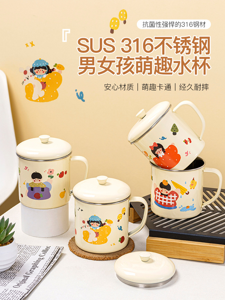 蓋付き 304 ステンレス鋼ウォーターカップ、模造エナメルカップ、オフィスドリンクカップ、クリエイティブ漫画カップ、ティーカップ、コンパニオン