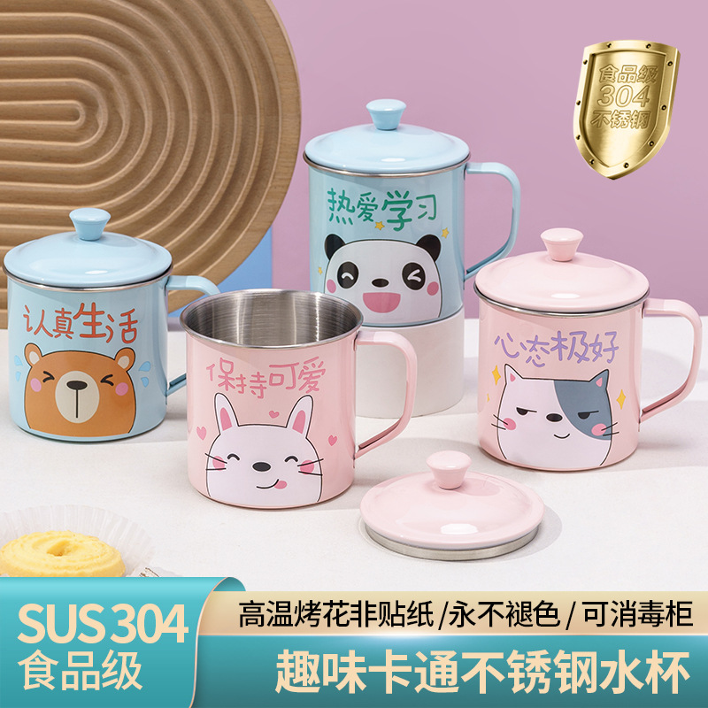 304 食品グレードのステンレス鋼の子供用家庭用ウォーターカップ漫画幼稚園ベビースペシャルオープンミルクカップ蓋付き