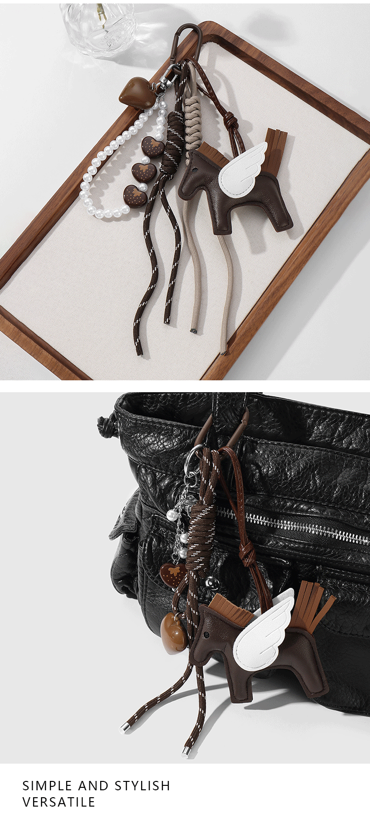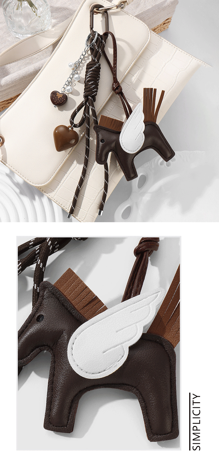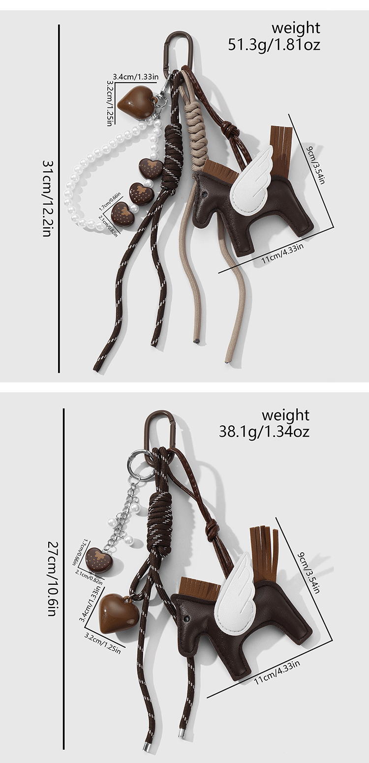 新款miu系风可爱复古时尚棕色皮革小马仿珍珠爱心DIY钥匙扣包挂件
