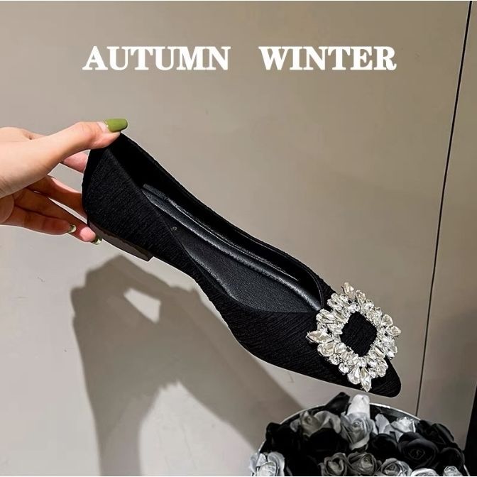 ポインテッドトゥフラットシューズ、女性用エレガントなシングルシューズ、2025年春秋新作、スクエアバックル、優しい雰囲気、クリスタルダイヤモンド付き豆豆シューズ