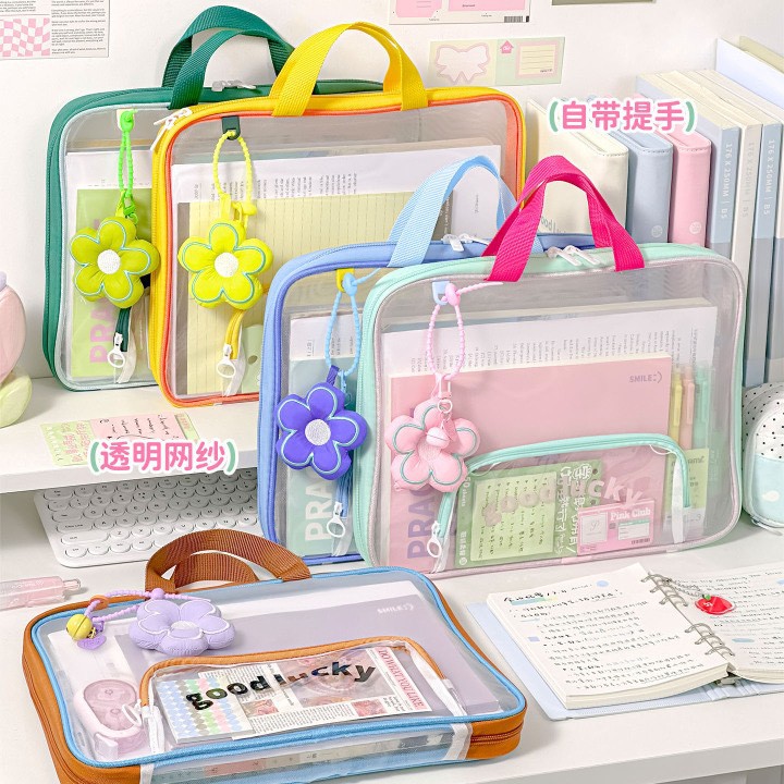 新款多巴胺文件袋大容量大学生手提包A4拉链透明课本资料收纳袋
