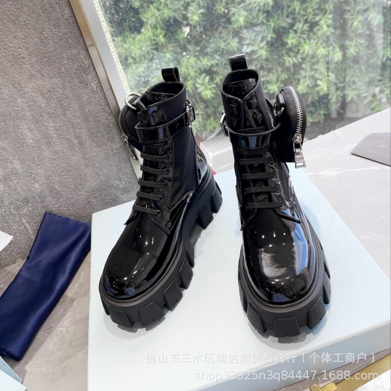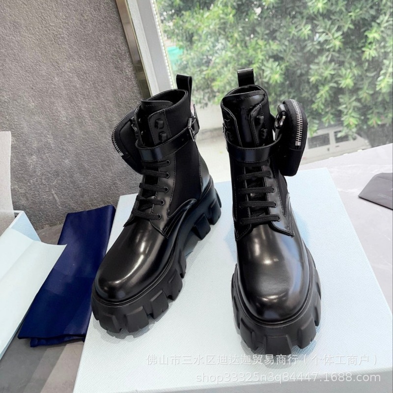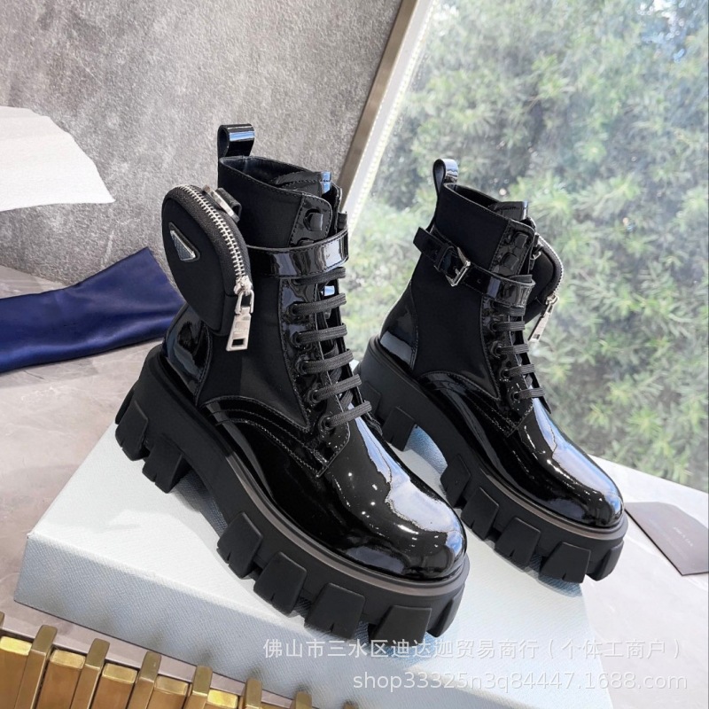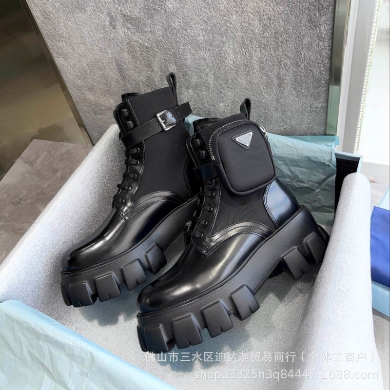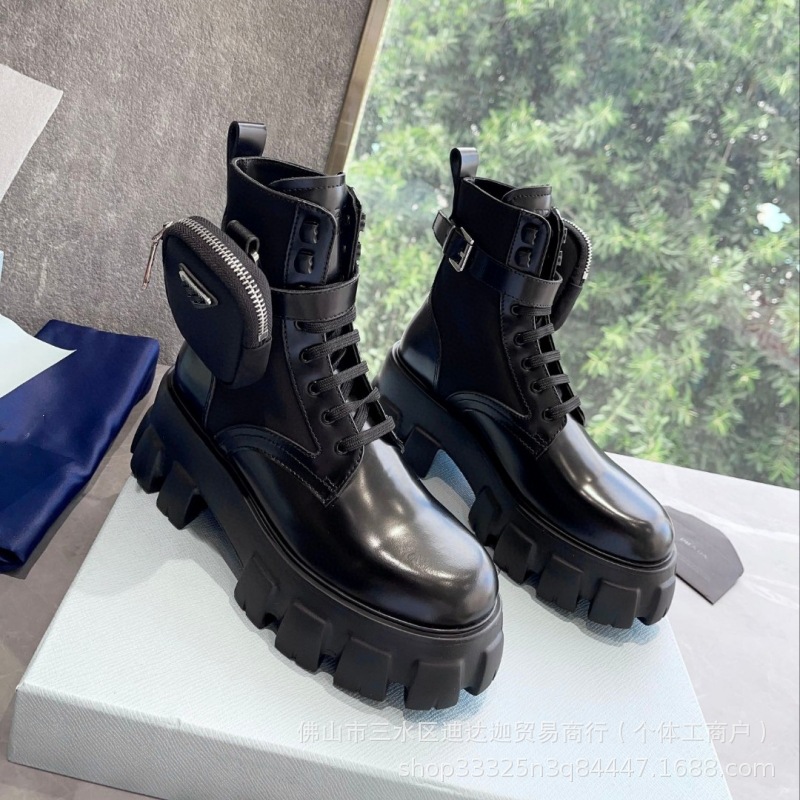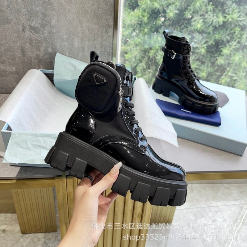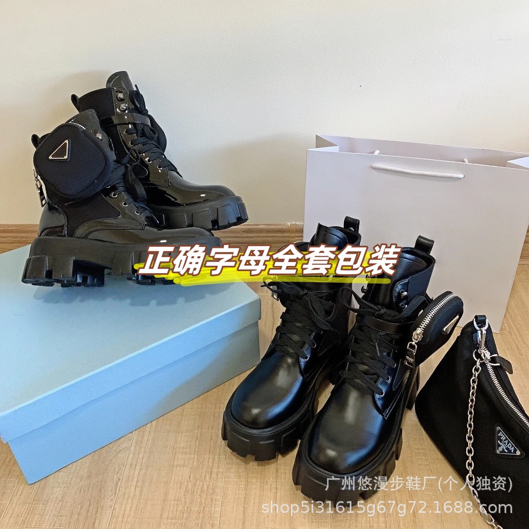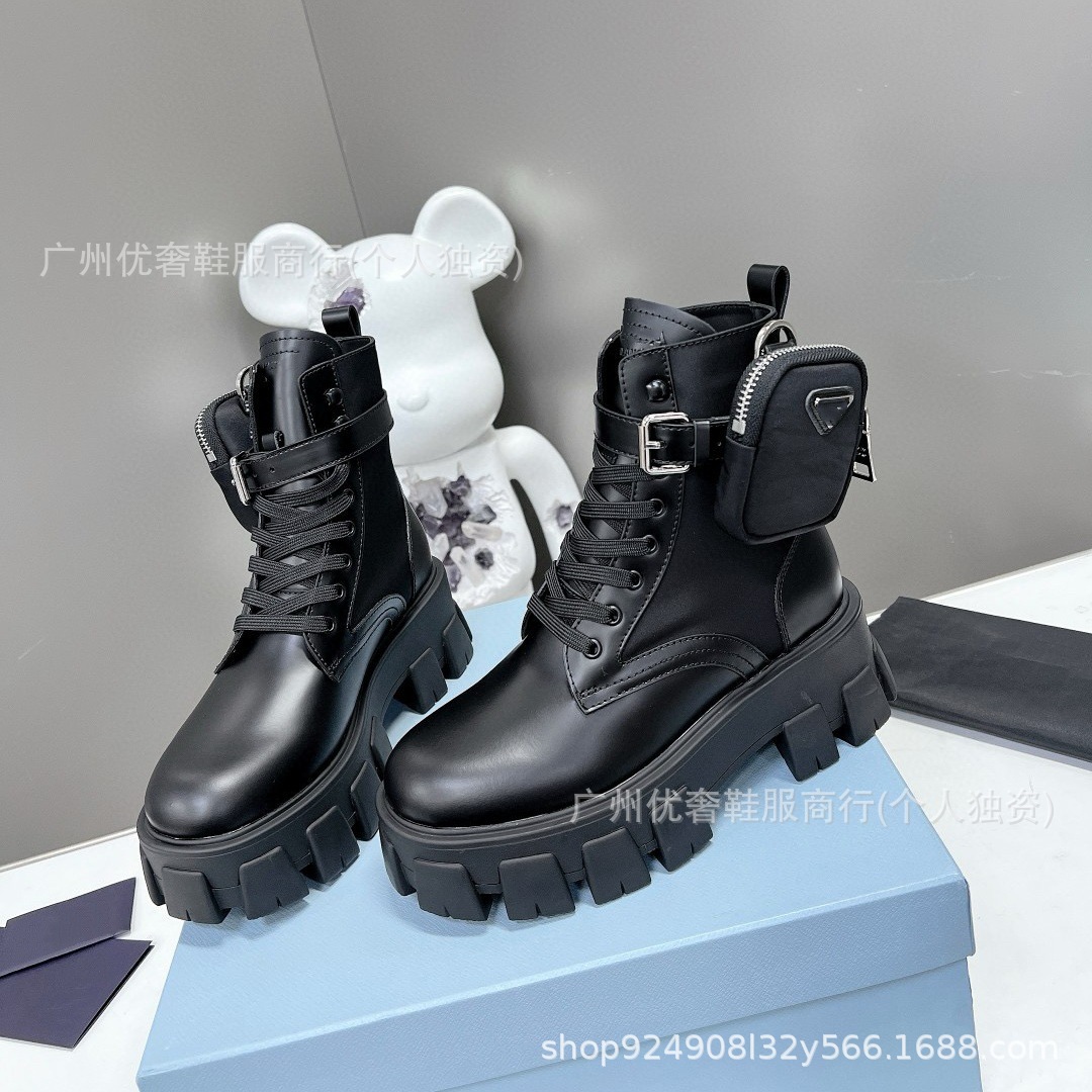P家三角标口袋包包靴女秋冬款英伦风厚底增高机车短靴黑色马丁靴