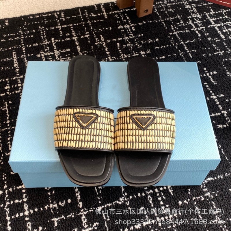 三角形のロゴ入り、四角いつま先のビーチサンダル、籐草編みの平底レディースサンダル、ビーチカジュアル、滑り止め、通気性、軽量