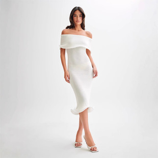 欧米風新作クロスボーダーレディースエレガントファッションラペルオフショルダードレスニットロングワンピース