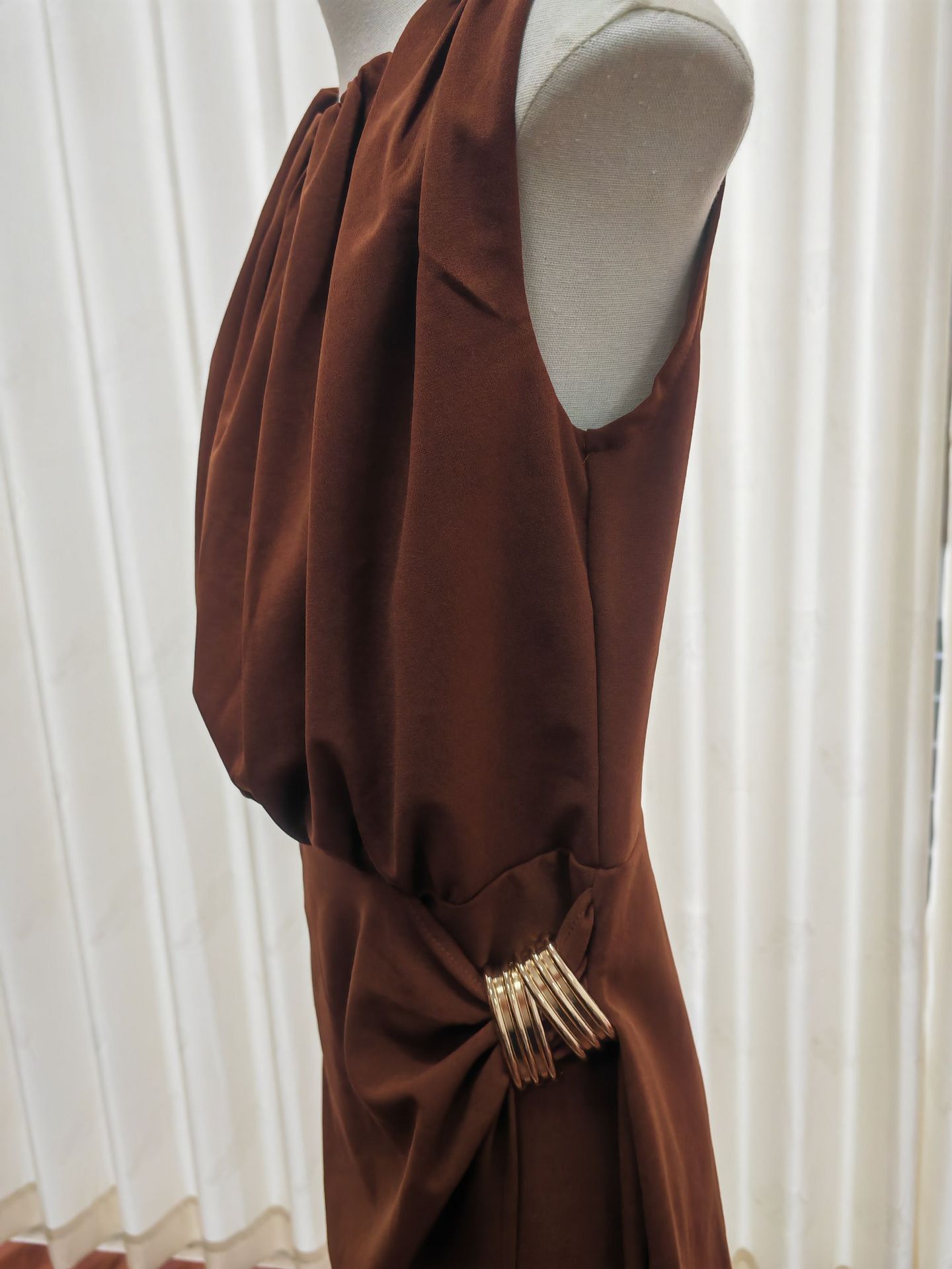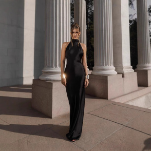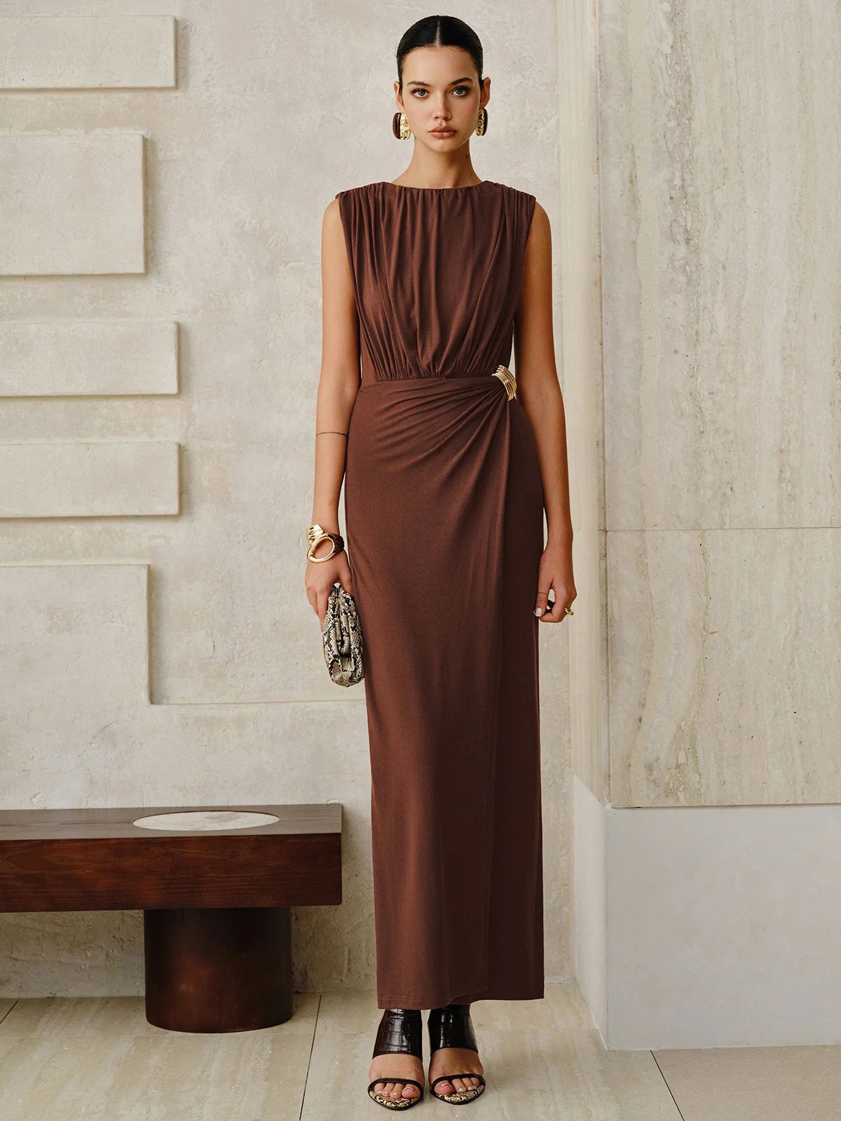 欧美2025新款跨境女装褶皱修身无袖长裙时尚金属装饰纯色连衣裙