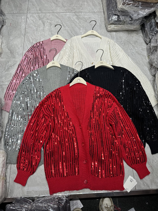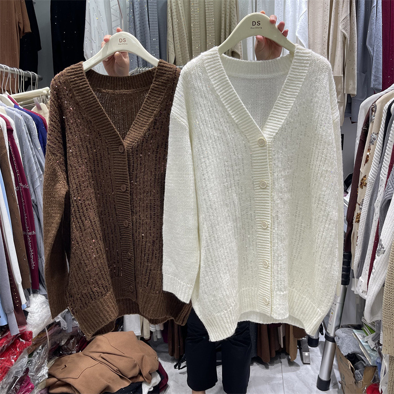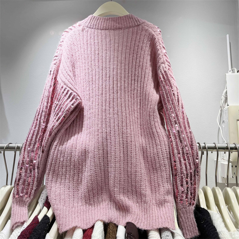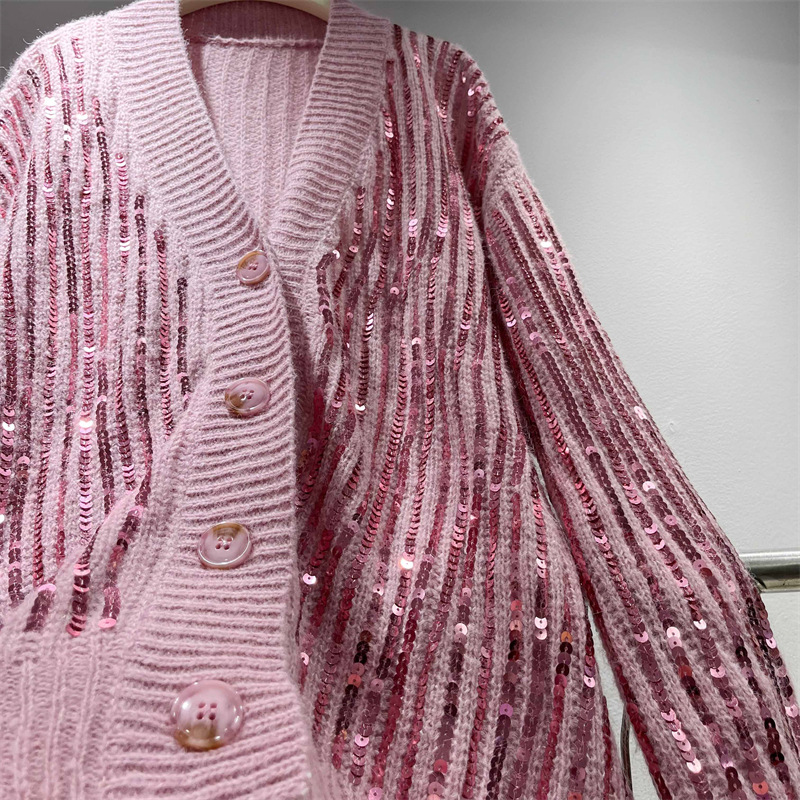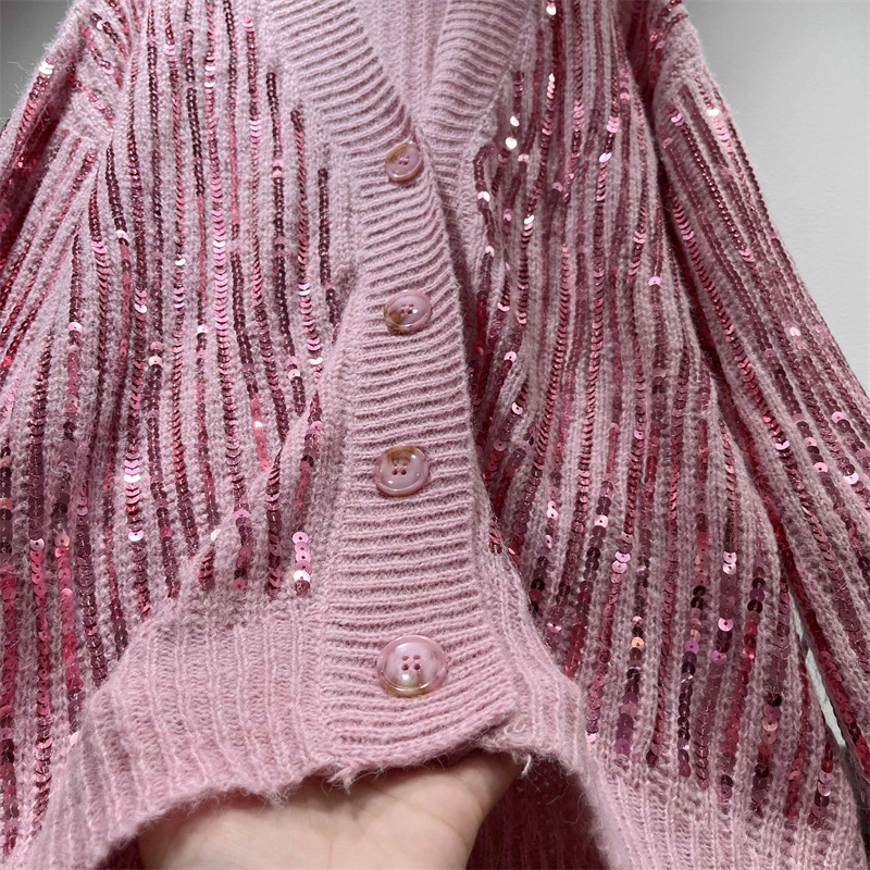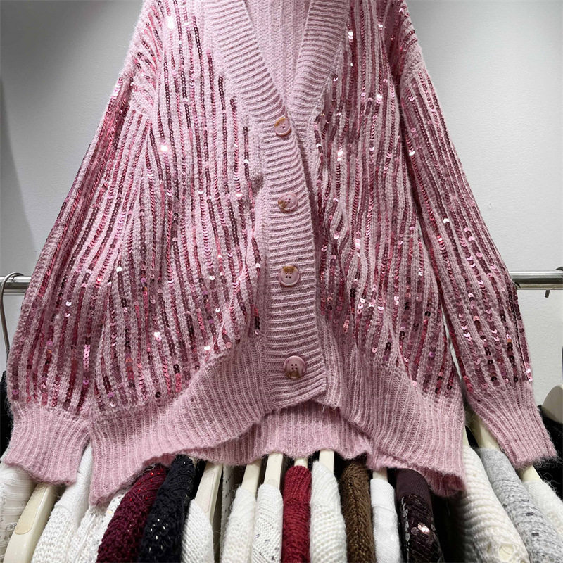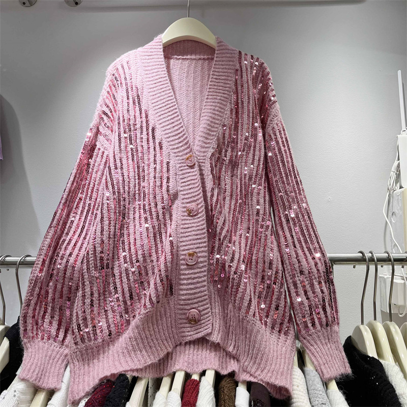 欧美跨境重工亮片针织开衫女秋冬新款慵懒风宽松大码V领毛衣外套