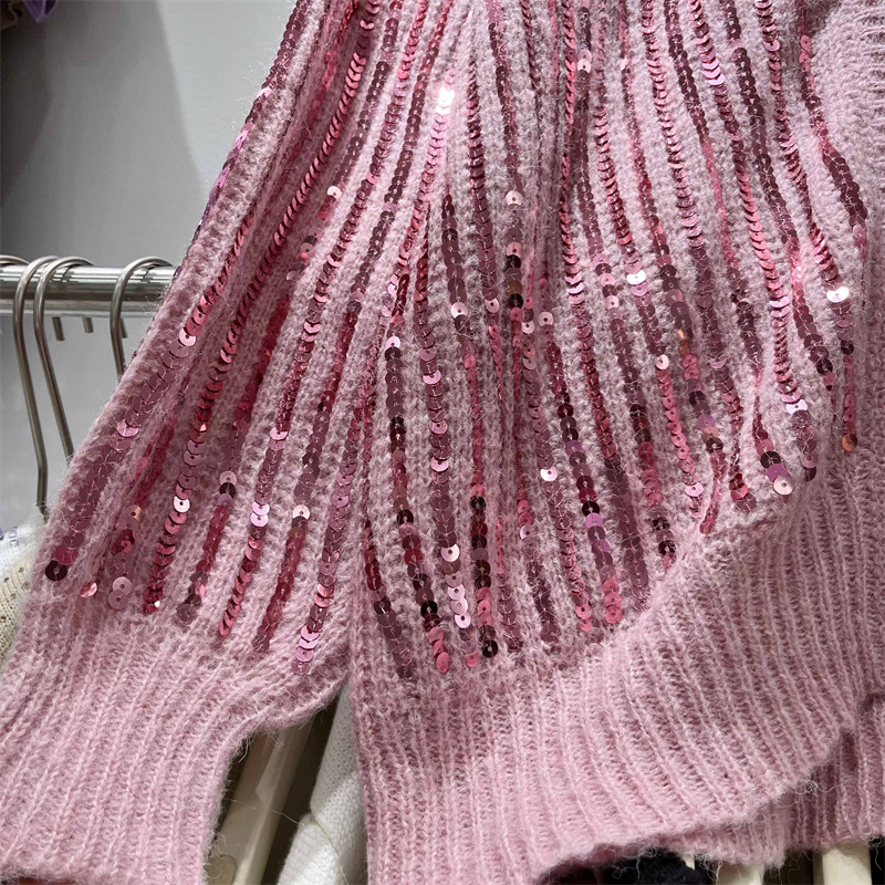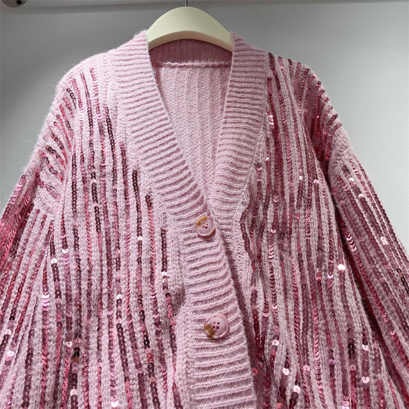 欧货v领毛衣外套女秋冬新款重工洋气法式亮片宽松慵懒风针织开衫