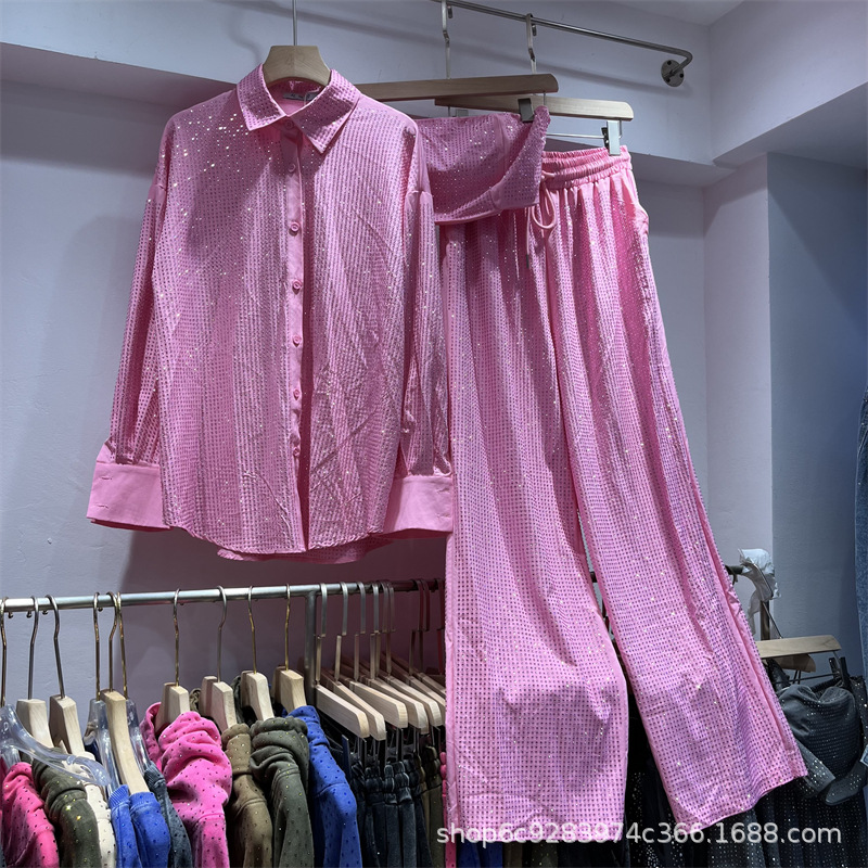 ファッションの経典のファッションのシャツの3つのセットの2024春と秋の婦人服の豪華な重工の熱いドリルのシャツは胸の広い足のズボンを拭きます。