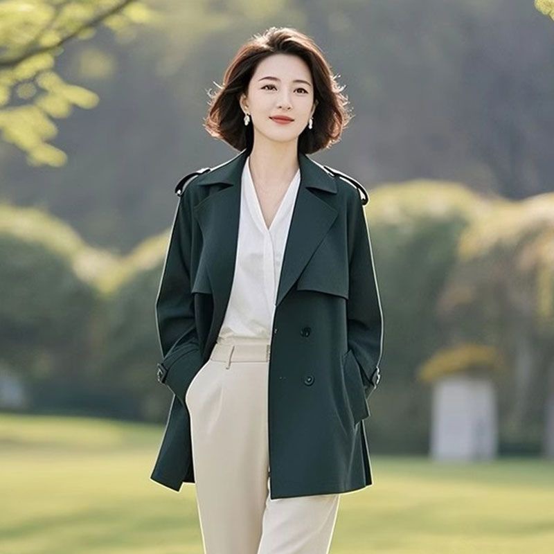 春の2025春の新型の独特なショートコートの女性の小さい人はカジュアルな緑色の外着の気質の風衣を着ます。