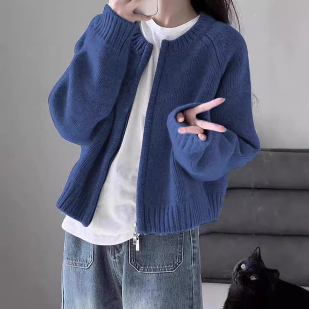 2025年秋冬新作韓国風レディースウールセーター、スタンドカラー長袖無地カシミヤ風ジップアップカーディガン