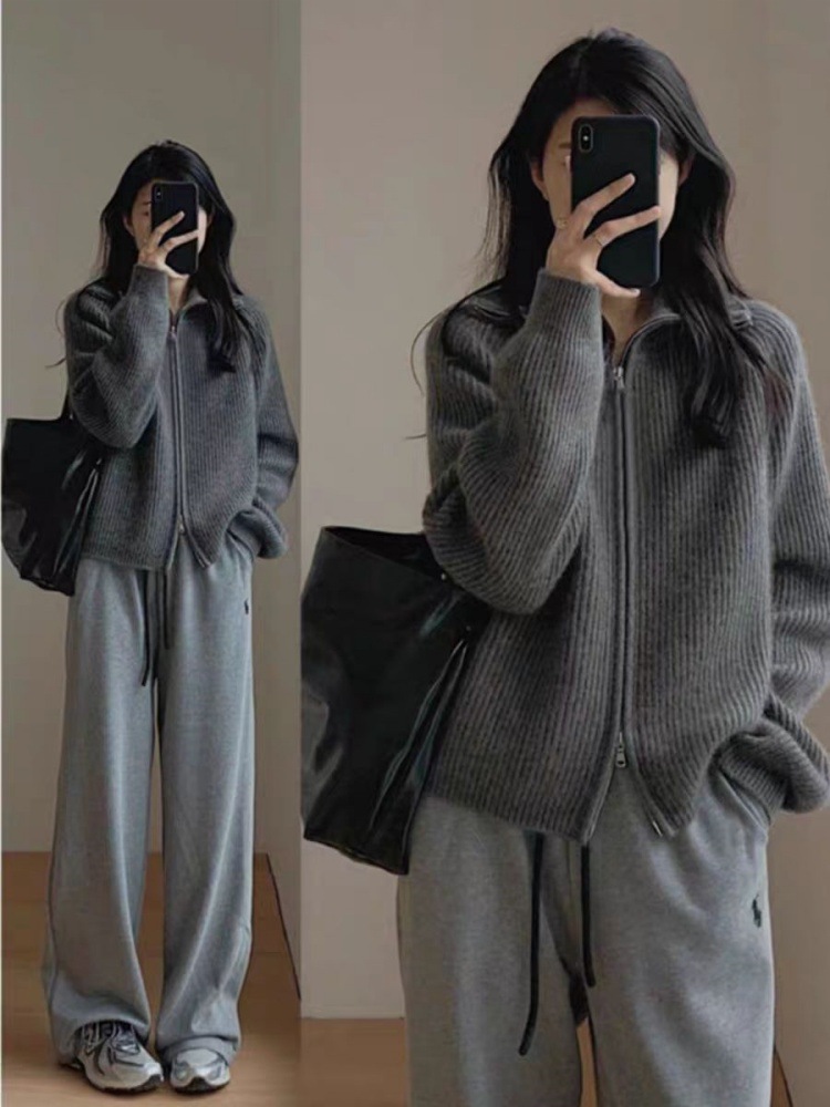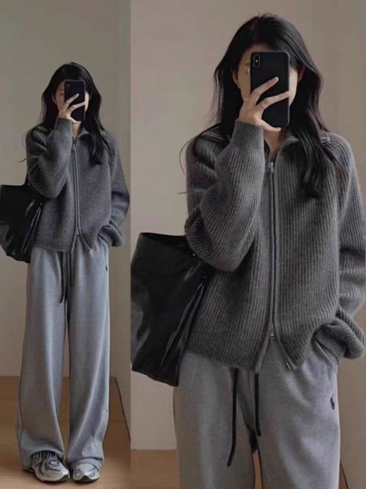 山羊绒开衫女纯色秋冬新款拉链高领宽松加厚羊绒外套针织上衣