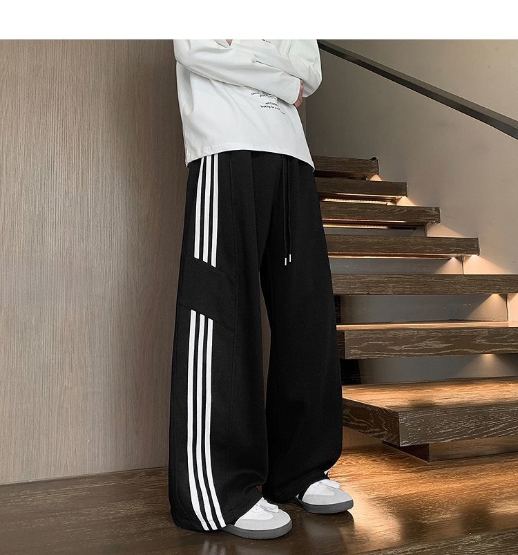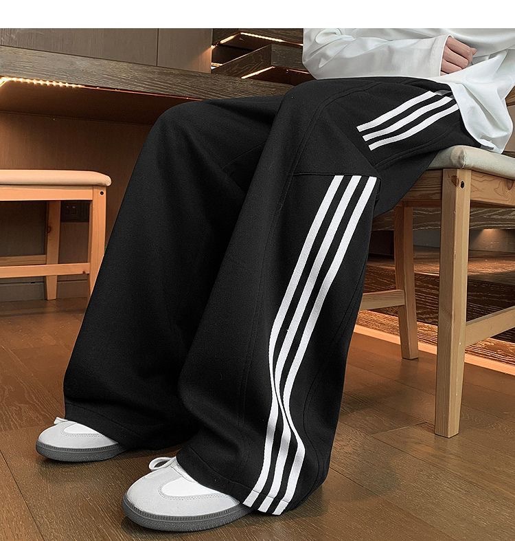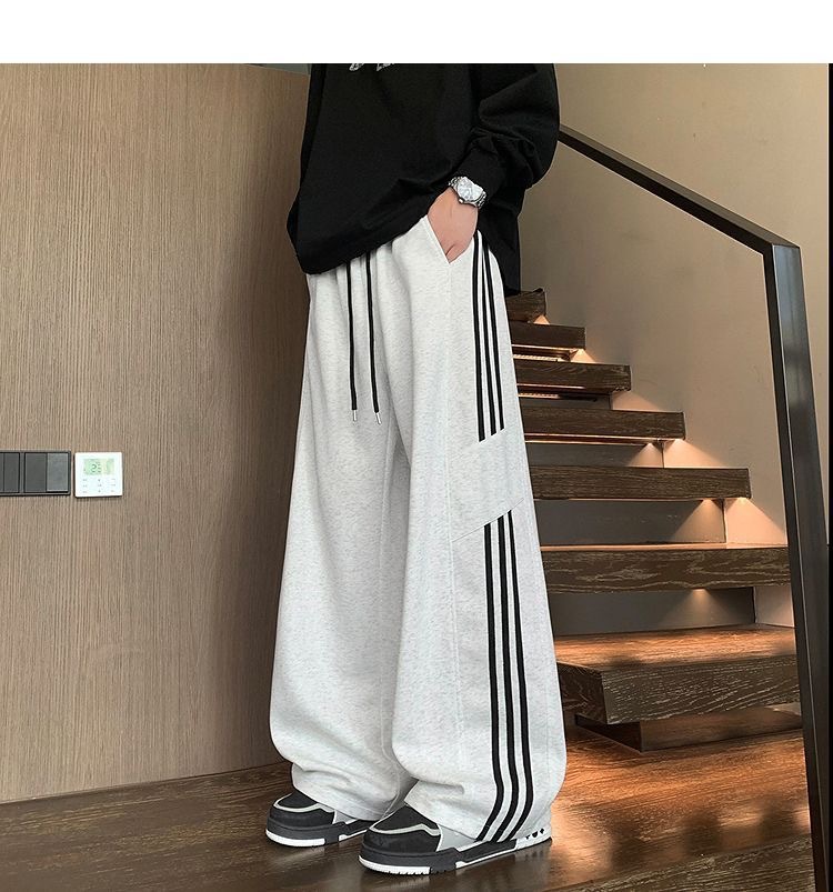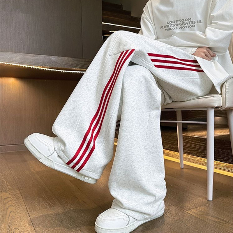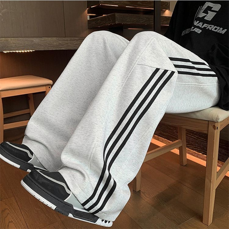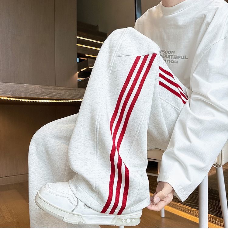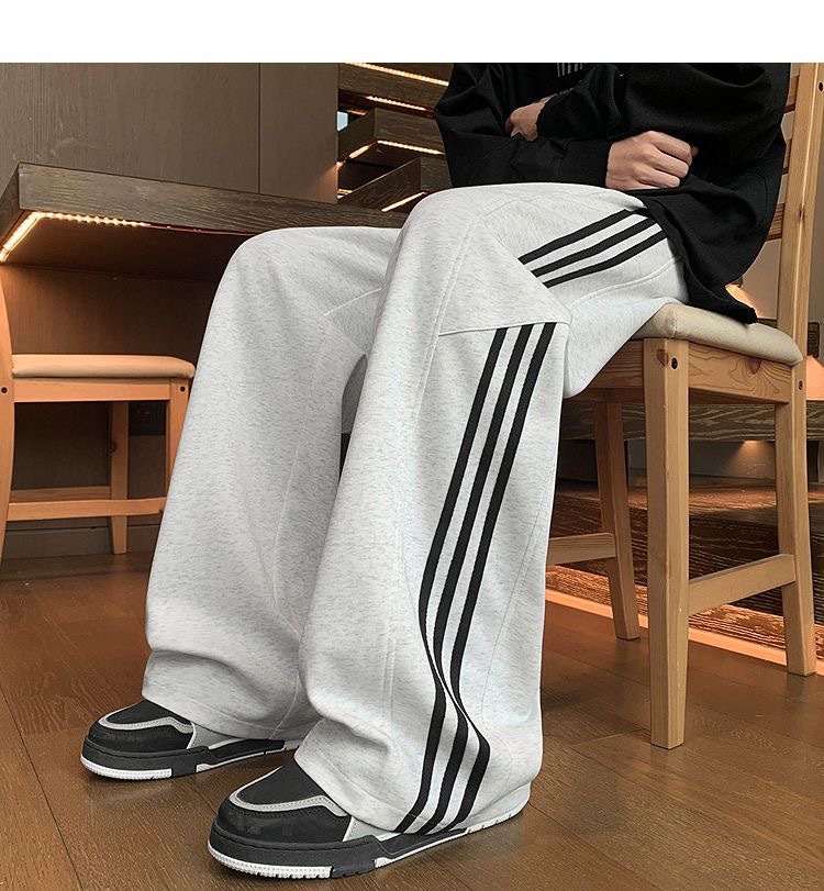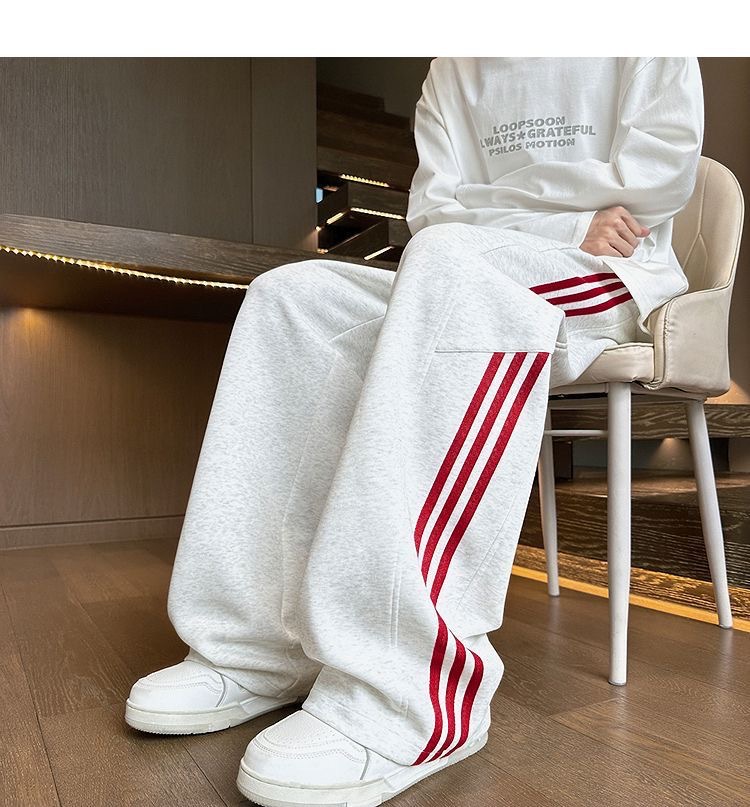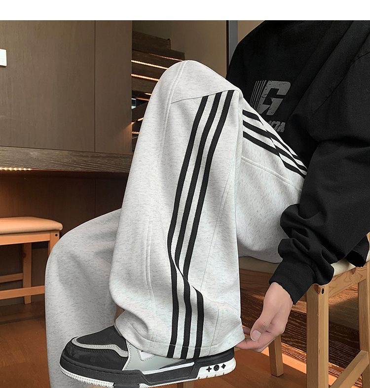 裤子男秋冬季2025新款运动港风阔腿宽松加绒休闲裤直筒条纹长裤潮