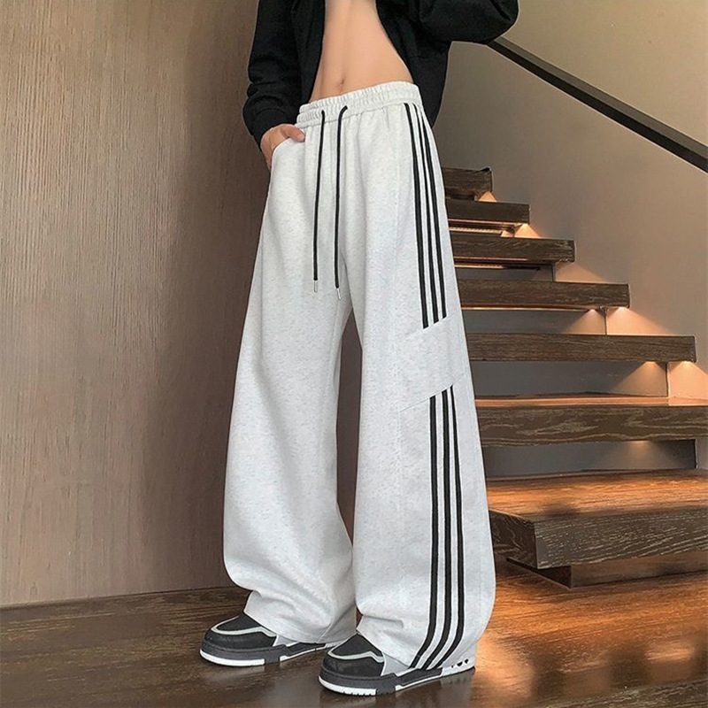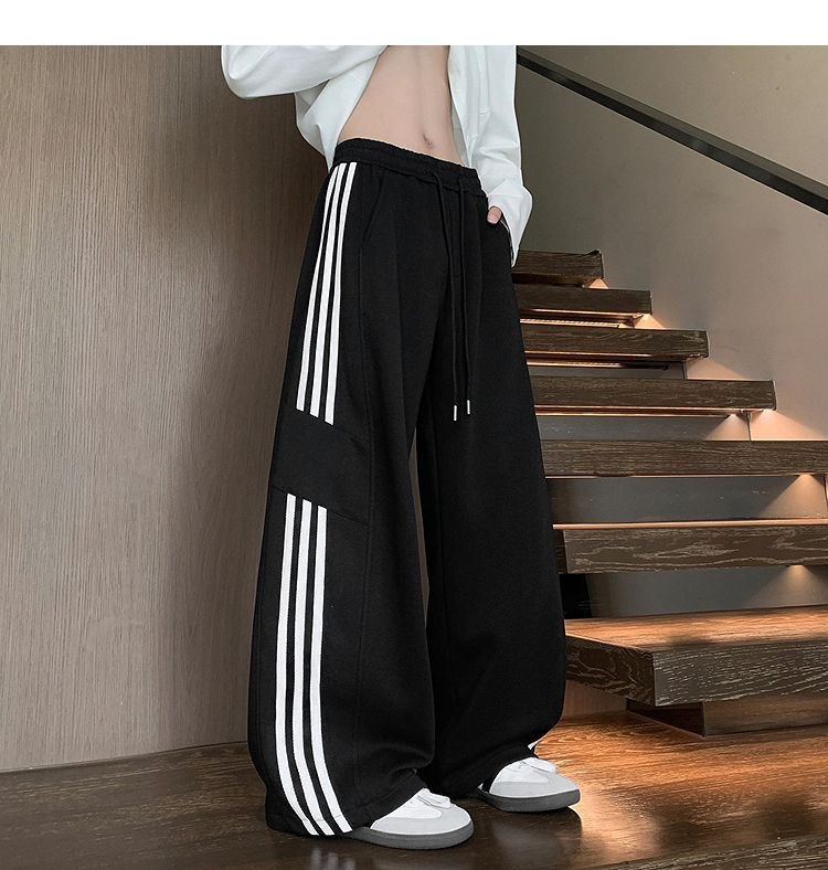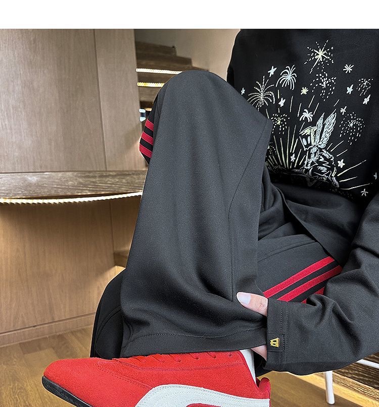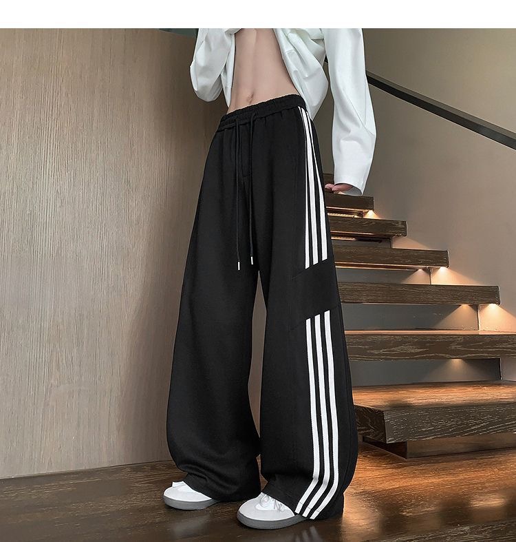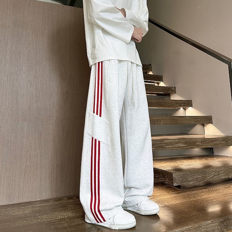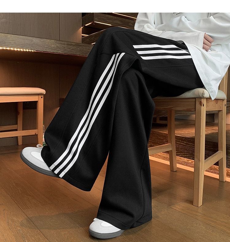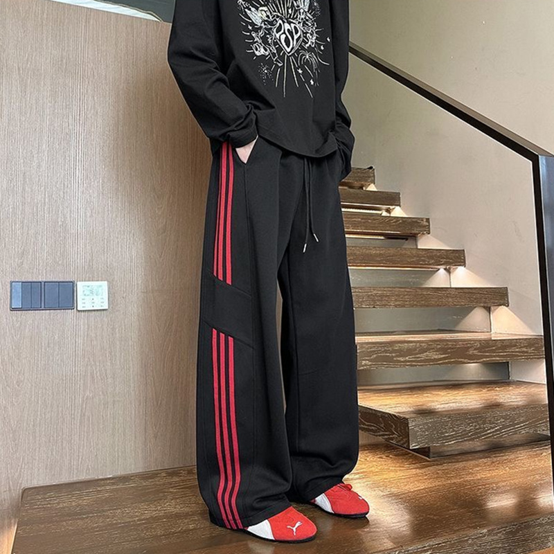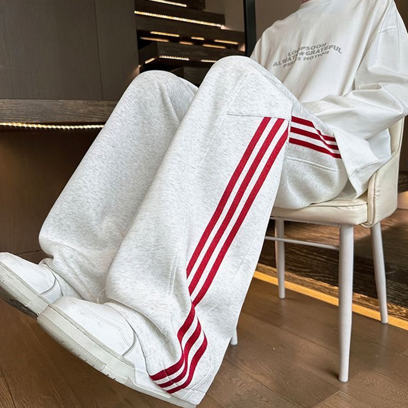 裤子男秋冬季2025新款运动港风阔腿宽松加绒休闲裤直筒条纹长裤潮