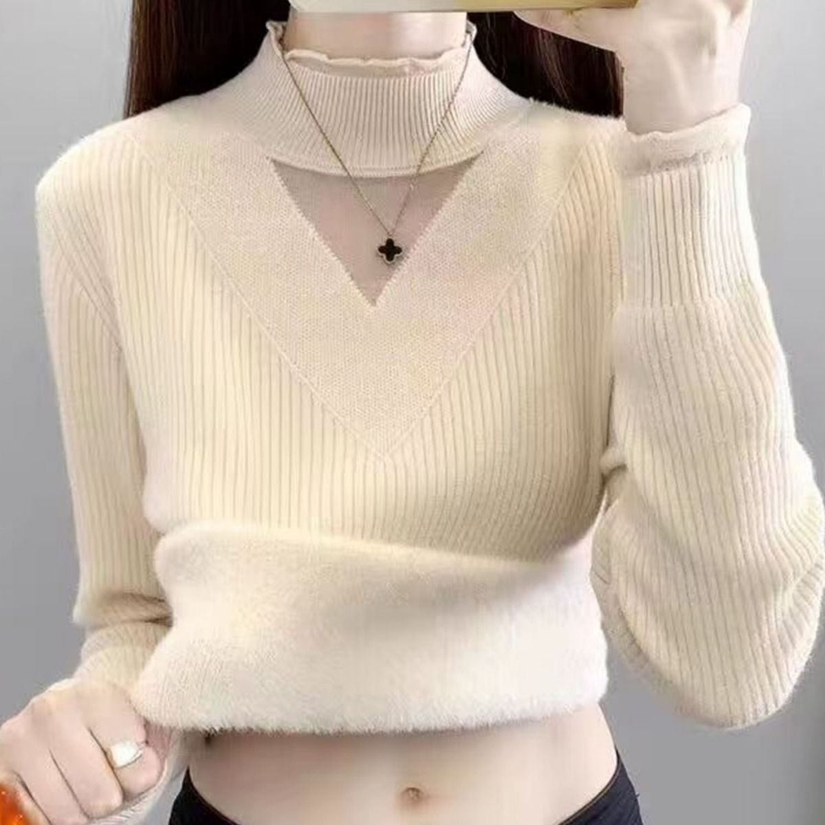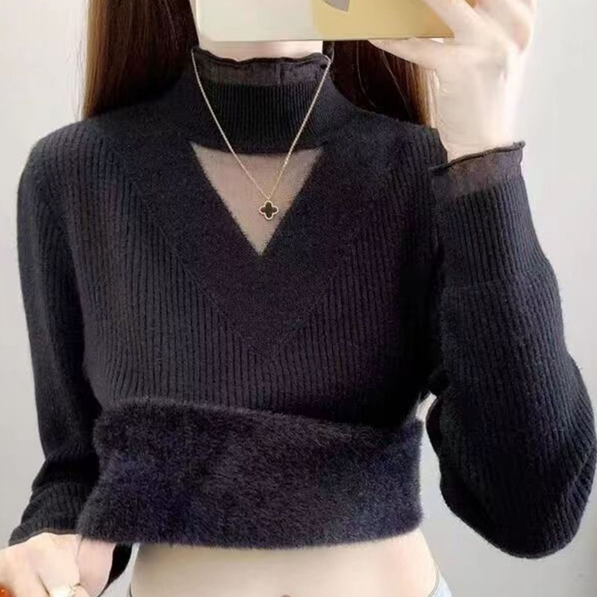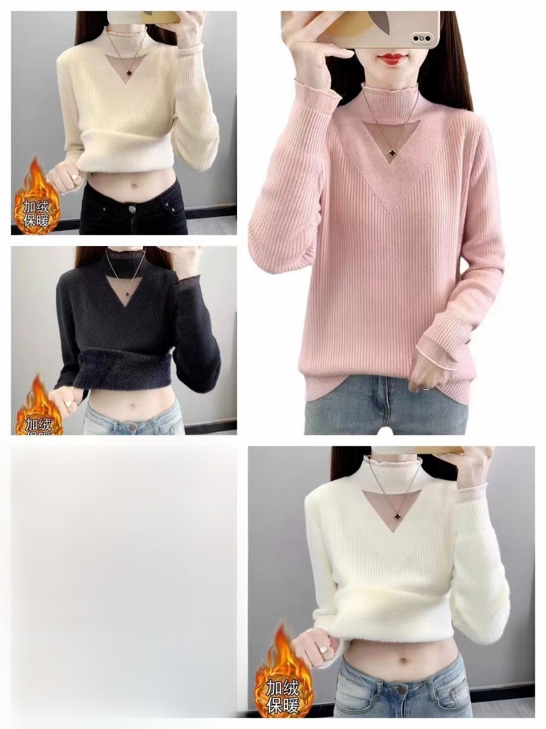 一体绒加绒加厚半高领毛衣女秋冬新款蕾丝边针织衫保暖打底衫内搭
