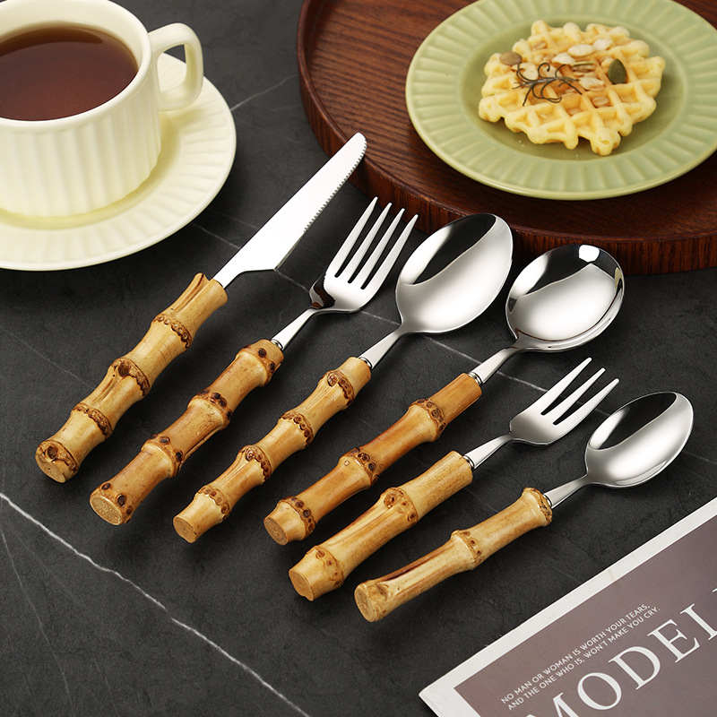 国境を越えた天然竹柄ステンレス食器デザートサラダスプーンフォーク竹節ハンドル洋食ステーキナイフフォークスプーン茶スプーン