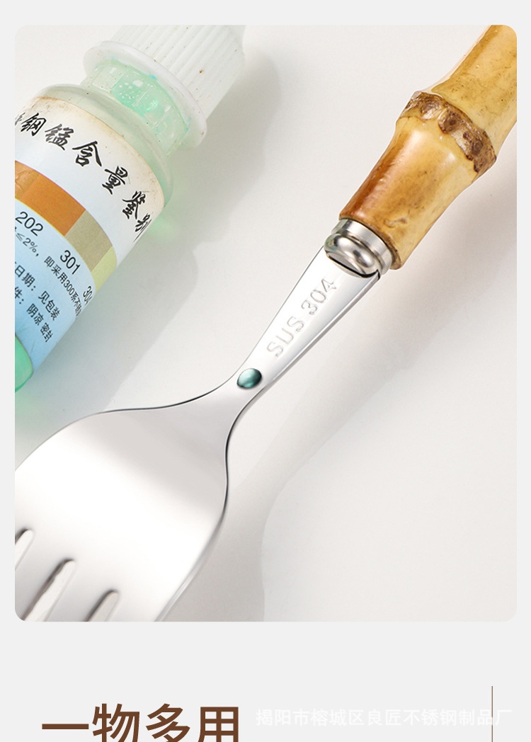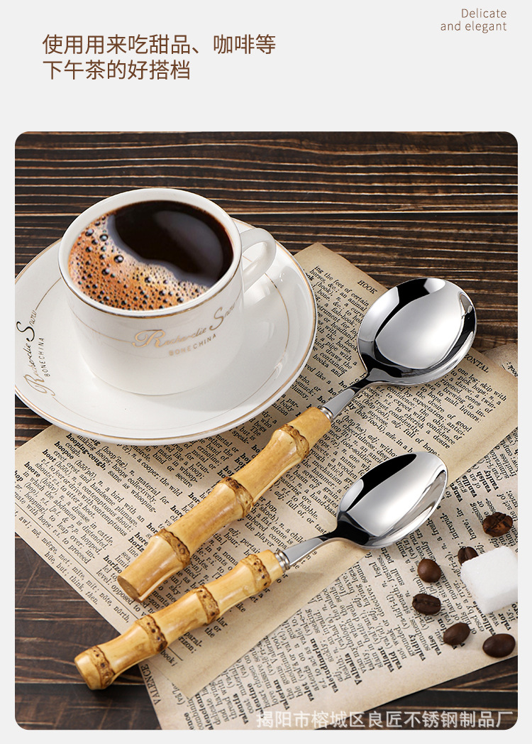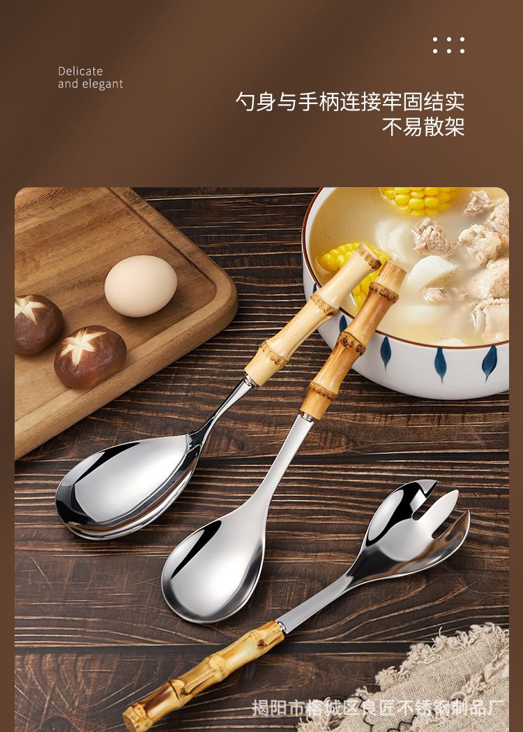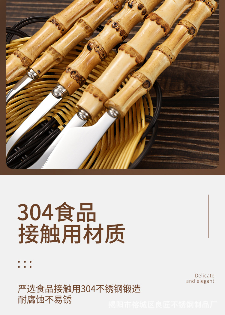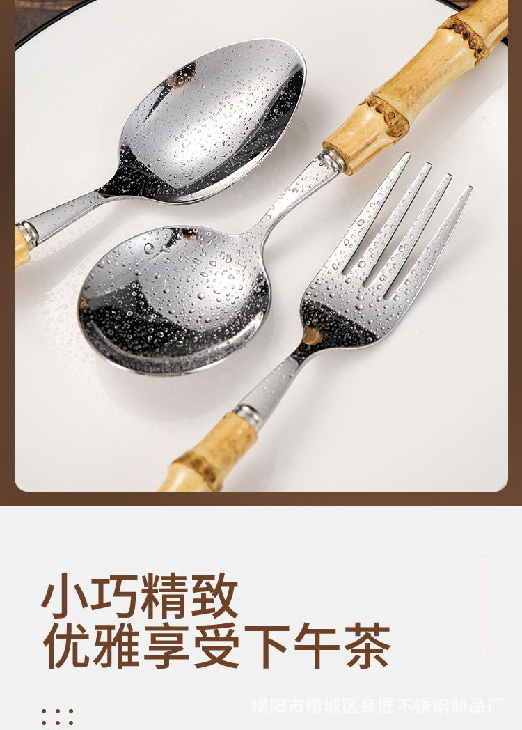 跨境天然竹柄不锈钢餐具甜品沙拉勺叉茶勺竹节手柄西餐牛排刀叉勺