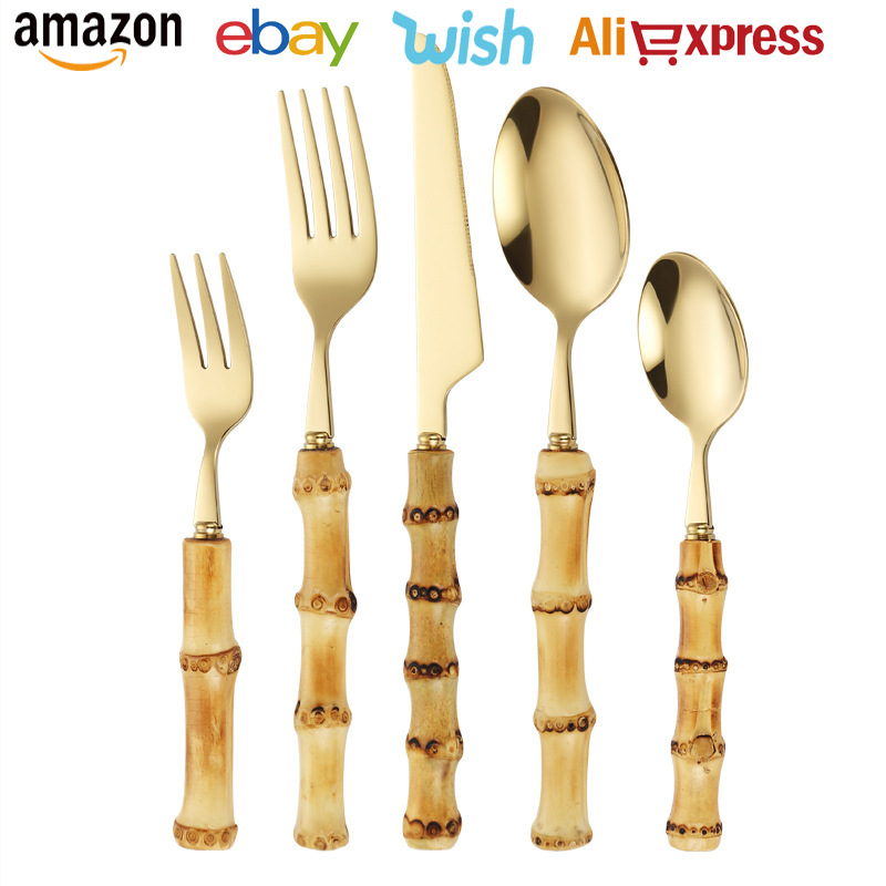 国境を越えた人気の天然竹ステンレス食器本物の竹スプーン洋食ナイフ、フォーク、スプーン木製ハンドル食器セット
